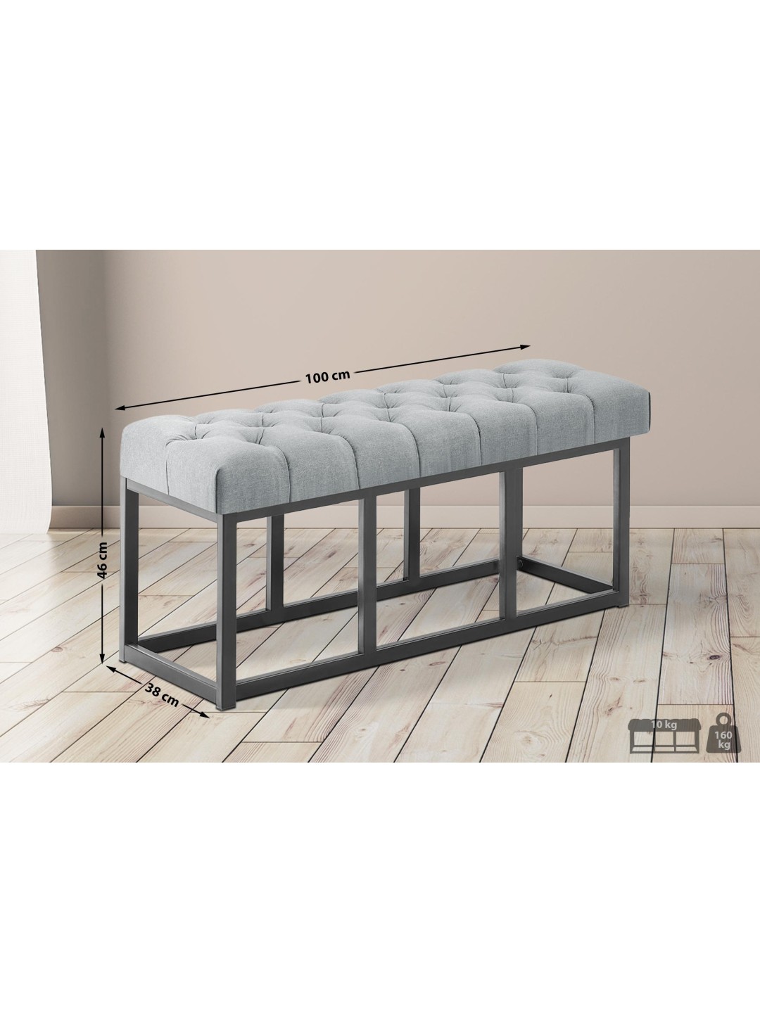 El banco tiene una estructura estable de metal negro mate. Los tirantes transversales lo hacen tan estable que se puede cargar con seguridad hasta 150 kilogramos. Los suelos sensibles no se dañan gracias a los protectores de suelo.