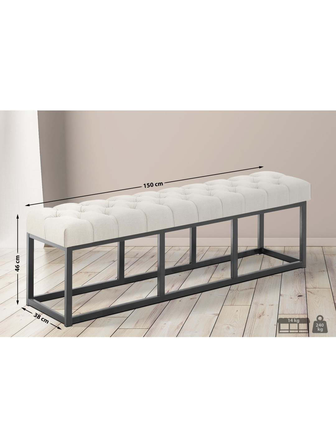 La tapicería acolchada está cubierta con un tejido duradero y de fácil cuidado. El banco tapizado se integra de forma flexible y elegante en cualquier estancia, ya sea en el salón, el pasillo, el comedor o el dormitorio.