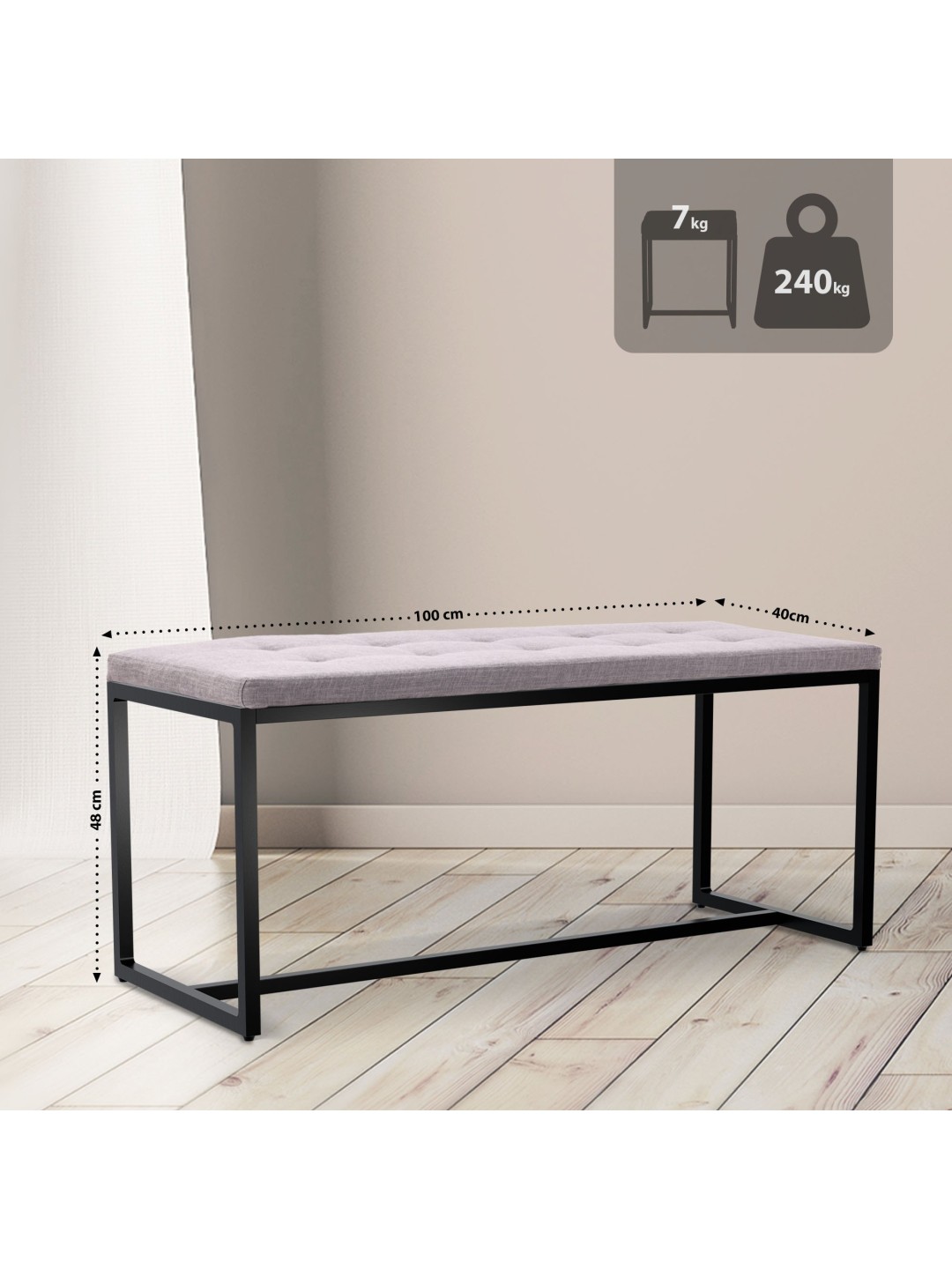 La estructura del banco puede soportar hasta 240 kilogramos y ofrece un alto nivel de estabilidad gracias a cuatro patas robustas y un travesaño.