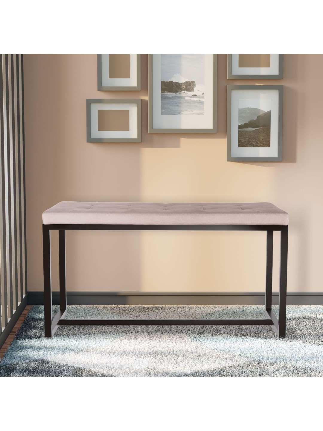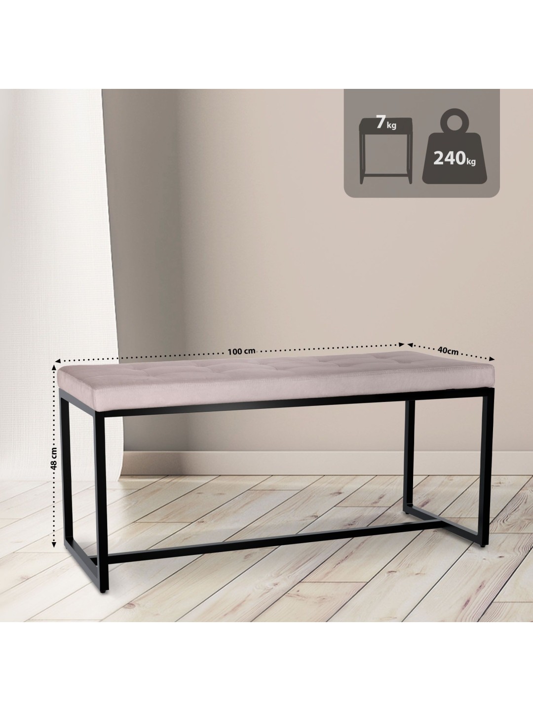 El banco se sostiene de forma estable sobre una estructura de cuatro patas. El banco está disponible con revestimiento de piel sintética, terciopelo o tela. La robusta elaboración del hierro con recubrimiento en polvo garantiza una calidad y fiabilidad duraderas.