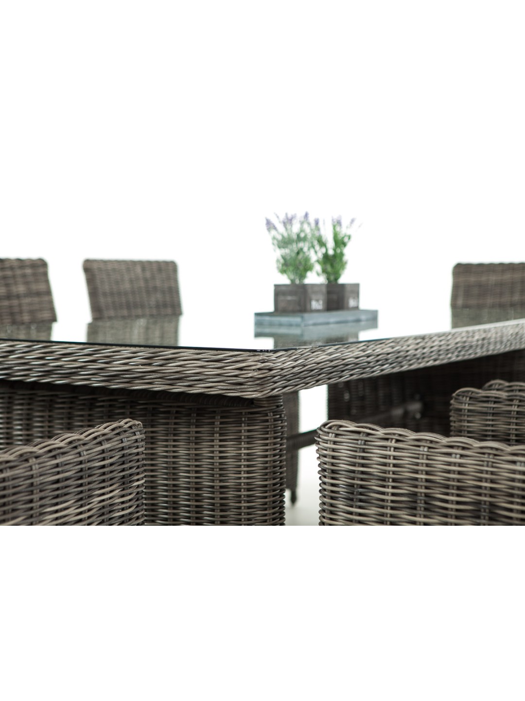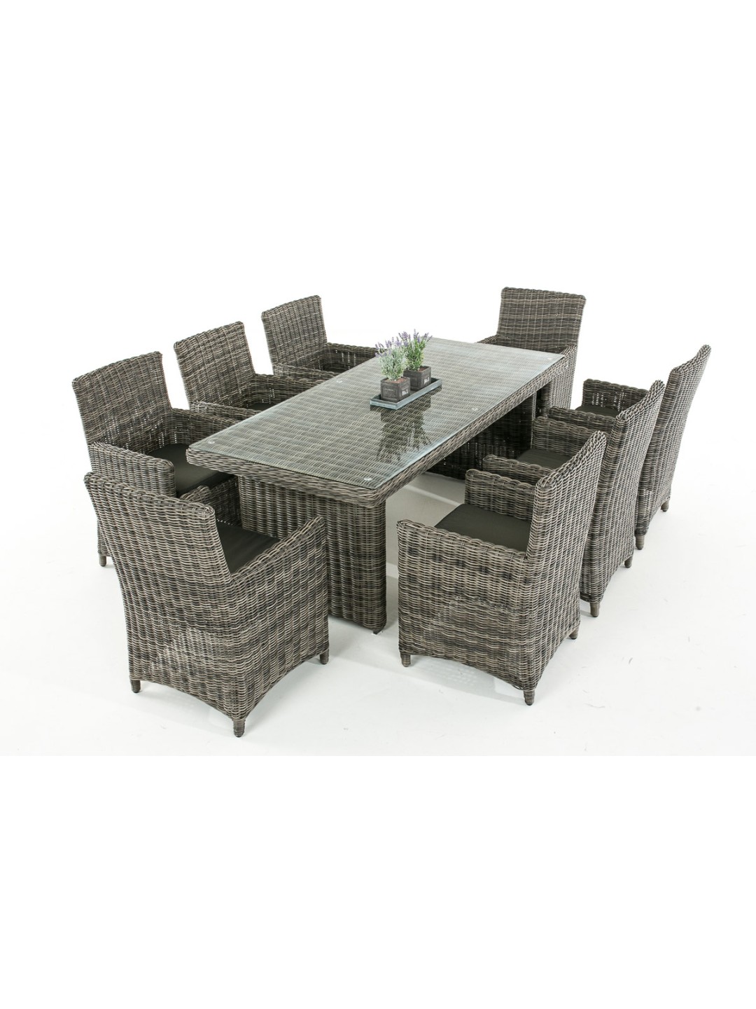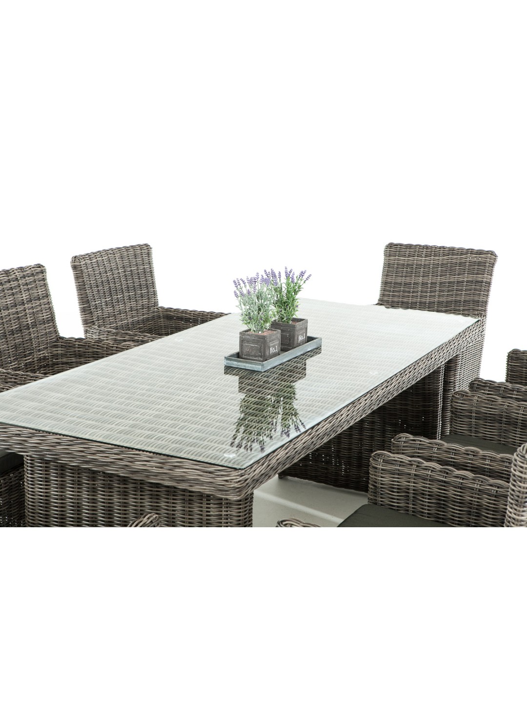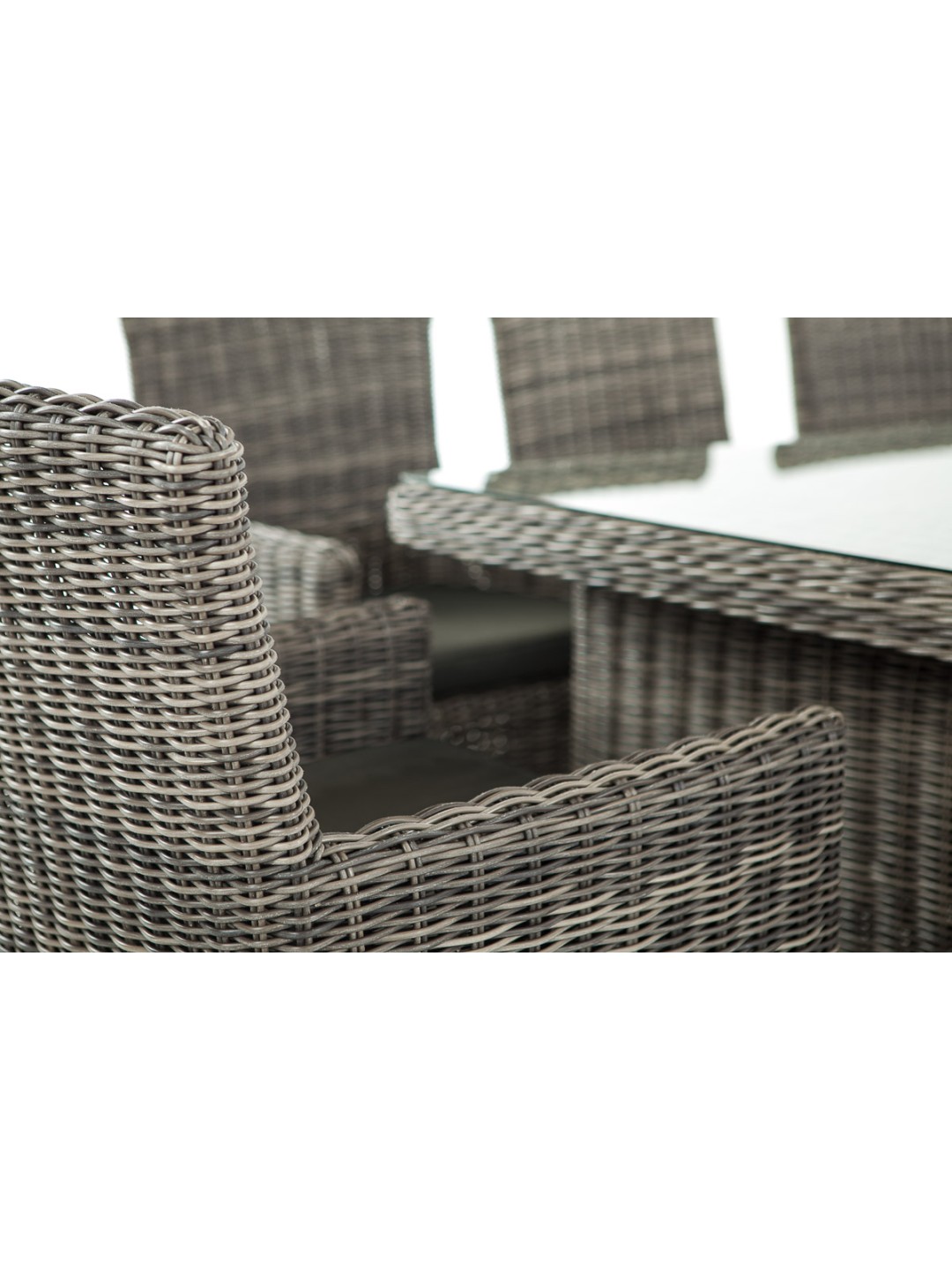 Combinación de alta calidad: elegante y ergonómica. Gracias al respaldo inclinado combinado con los agradables reposabrazos elevados y al cómodo cojín del asiento, que ya está incluido en el suministro, estas sillas de jardín son ideales para sentarse. Su estructura está completamente trenzada con poliratán, lo que no sólo crea un aspecto atractivo sino que también proporciona una estabilidad especialmente alta. En la mesa de este juego, las patas en cada extremo de la mesa están estrechamente entrelazadas de manera similar. La unión entre la malla compacta y el tablero de cristal resulta muy exitosa. Se apoya en sus bordes redondeados mediante cuatro pomos de goma transparentes antideslizantes.
