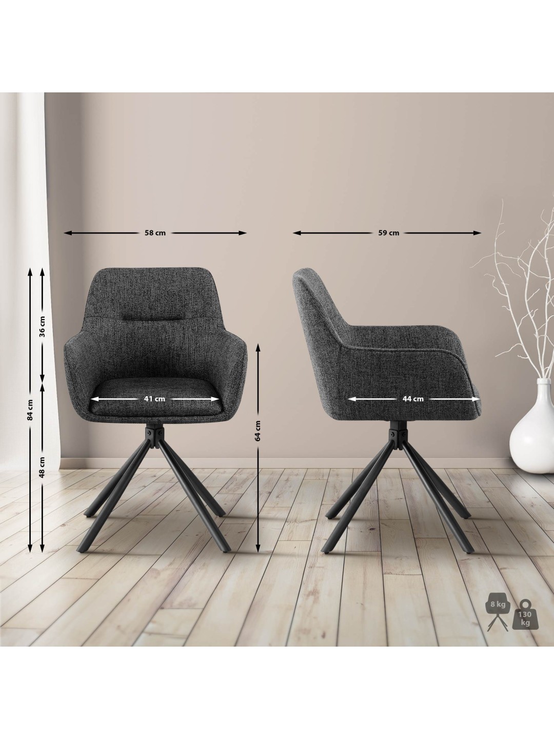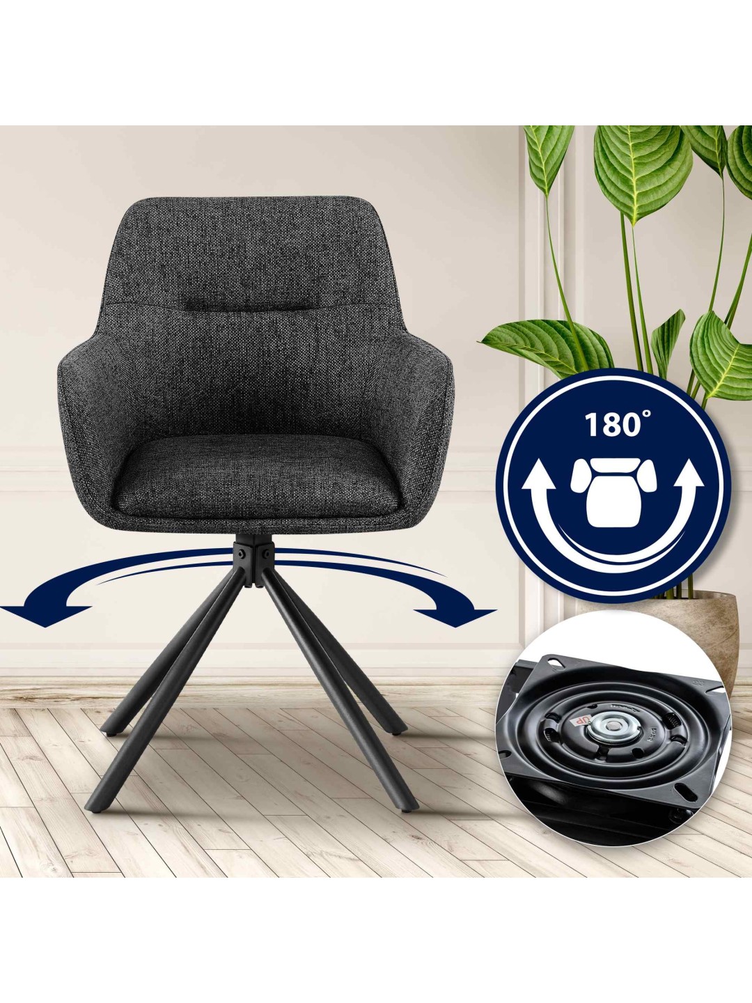 El llamado mecanismo de giro automático garantiza que el asiento de la silla del comedor pueda girarse en un rango de 180 grados, lo que proporciona libertad de movimiento adicional. La clave para un asiento cómodo es el agradable acolchado del asiento, el respaldo y los reposabrazos. La carcasa del asiento está revestida con una funda de tela resistente y fácil de cuidar.