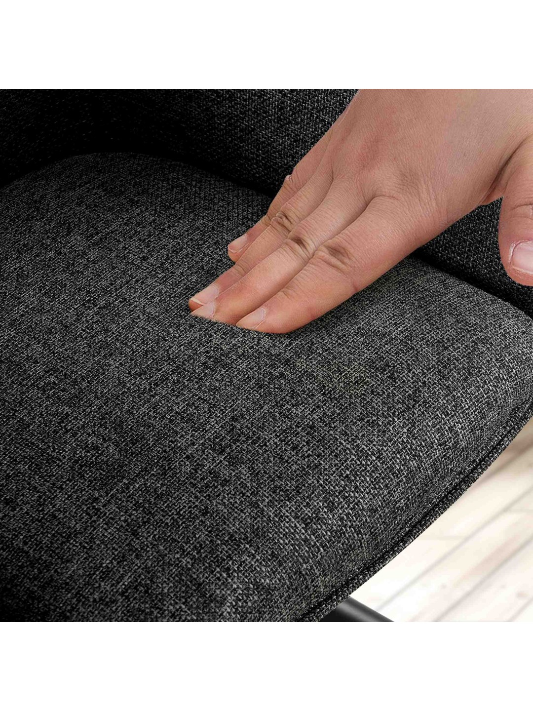 La base de esta silla tipo sillón es la estructura de cuatro patas de metal con recubrimiento en polvo en color negro mate. La silla de comedor Tipton puede soportar hasta 130 kilogramos sin dudarlo. Los protectores de suelo evitan que los suelos sensibles se rayen.
