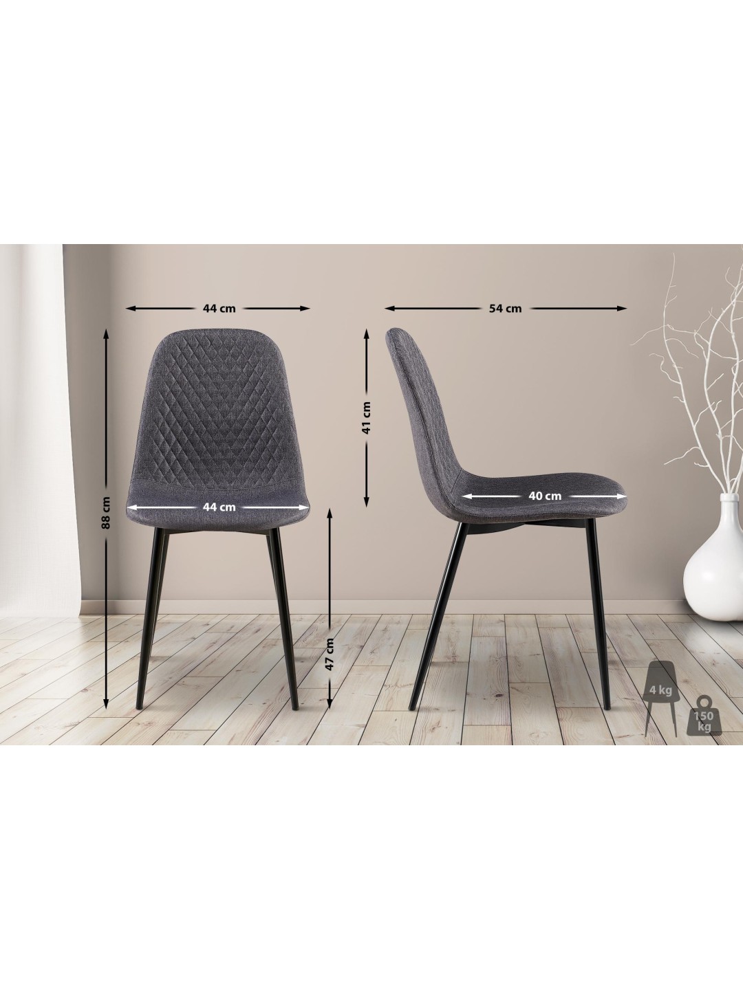 La robusta estructura de metal negro garantiza estabilidad y una gran capacidad de carga de hasta 150 kg por silla. Los protectores de suelo integrados protegen de arañazos las superficies delicadas, como el parquet o las baldosas, y al mismo tiempo permiten moverlas sin esfuerzo. Con una agradable altura de asiento de 47 cm, las sillas ofrecen el máximo confort, incluso en cenas largas con familiares o amigos.