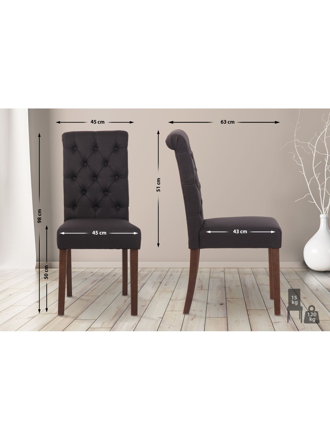 Las sillas de comedor Lisburn son asientos cómodos, sólidos y al mismo tiempo elegantes para el uso diario y el complemento perfecto para habitaciones con muebles clásicos. El respaldo alto y el agradable y cómodo acolchado le permitirán sentarse cómodamente incluso durante más tiempo. Estos sillones se mantienen estables y estables sobre una estructura de cuatro patas de madera de caucho. Equipado con protectores de suelo debajo de los pies, se evitan arañazos y daños en el suelo. Además, las sillas de comedor se pueden limpiar rápida y fácilmente en cualquier momento gracias a los materiales de fácil cuidado.