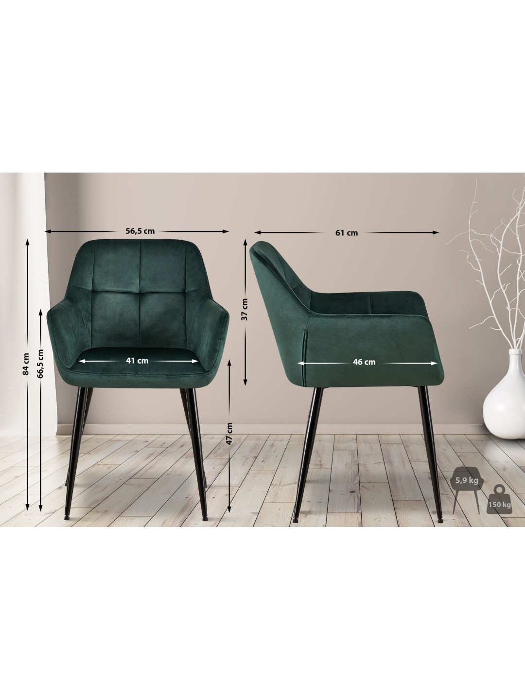 Juego de 2 sillas de comedor Emia terciopelo, verde