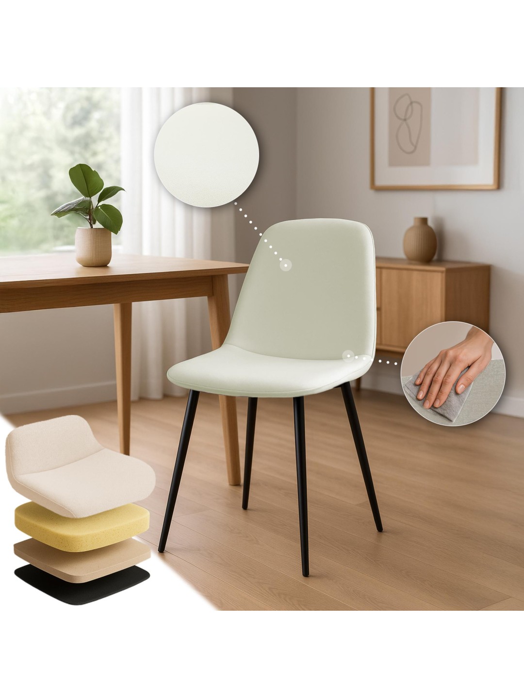 La base de esta silla de comedor es la estable estructura de cuatro patas hecha de metal con recubrimiento en polvo negro. La silla Maryam se puede cargar con hasta XXX kilogramos sin dudarlo. Los protectores de suelo evitan daños en suelos sensibles.