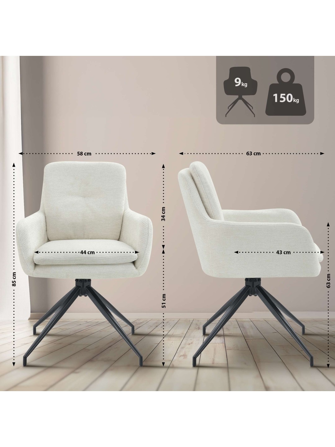 La base de estos sillones son las estructuras de cuatro patas de metal con recubrimiento en polvo en color negro mate. Las sillas de comedor Pickett pueden soportar hasta 150 kilogramos sin dudarlo.