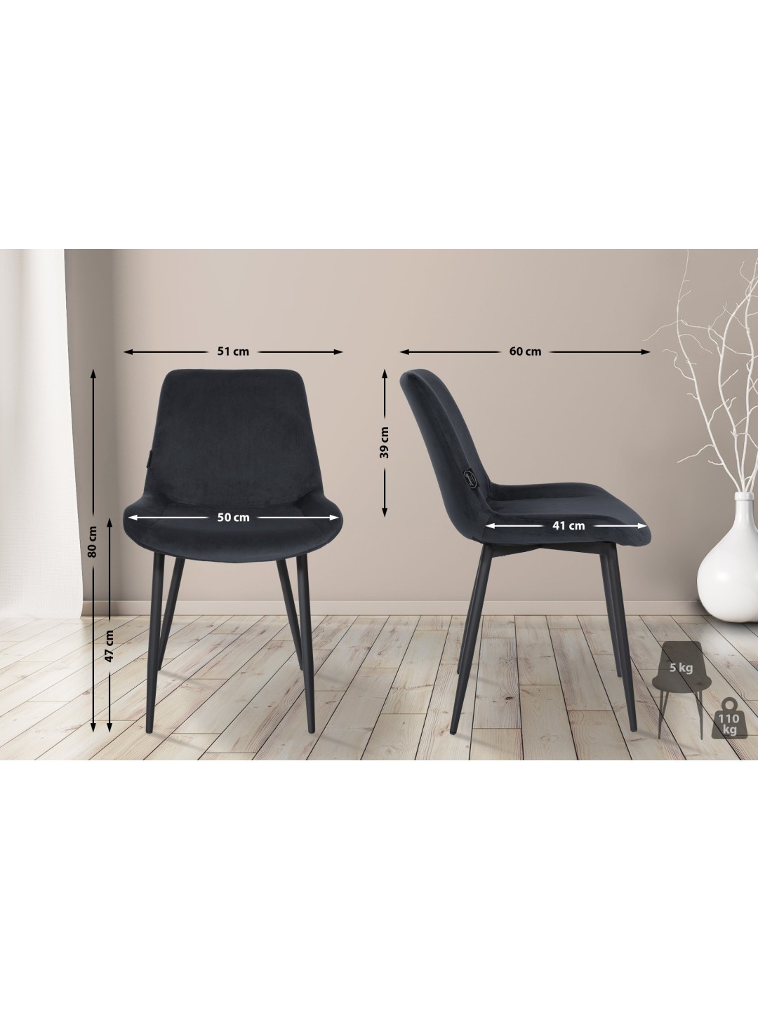 La base de estas sillas de comedor es la estable estructura de cuatro patas de metal resistente de color negro mate. Esto significa que las sillas Victoria se pueden cargar sin problemas con hasta 110 kilogramos. Los protectores de suelo evitan daños en suelos sensibles. Puede elegir entre colores sutiles y agradables (cinco en total).
