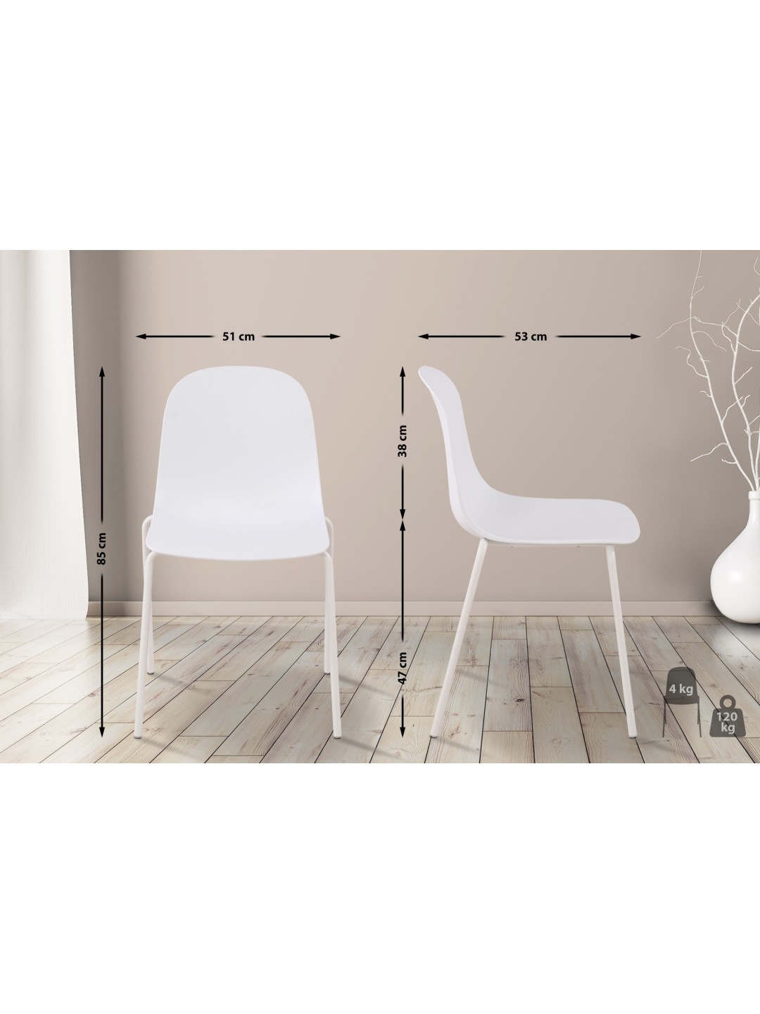 Fabricada con materiales resistentes a la intemperie, la silla Hardin se puede utilizar no sólo en interiores sino también en exteriores. Por lo tanto, esta silla apilable es una excelente opción como silla de jardín, para la terraza y el balcón, pero también es ideal como silla de cocina, silla de comedor, silla de bistró y para conferencias.