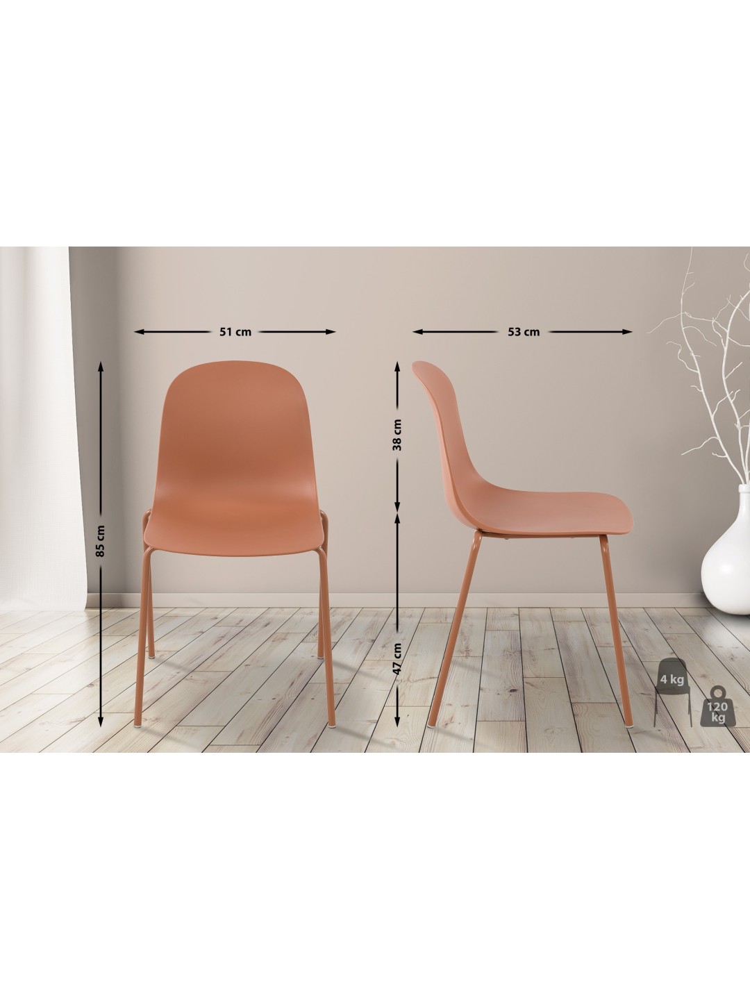 La carcasa del asiento está hecha de polipropileno estable, resistente a los rayos UV y a la intemperie, un plástico de alta calidad. La estructura de la silla está hecha de acero con recubrimiento en polvo, por lo que es resistente a la corrosión y no se oxida. Los colores de la carcasa del asiento y los armazones de la silla están coordinados.