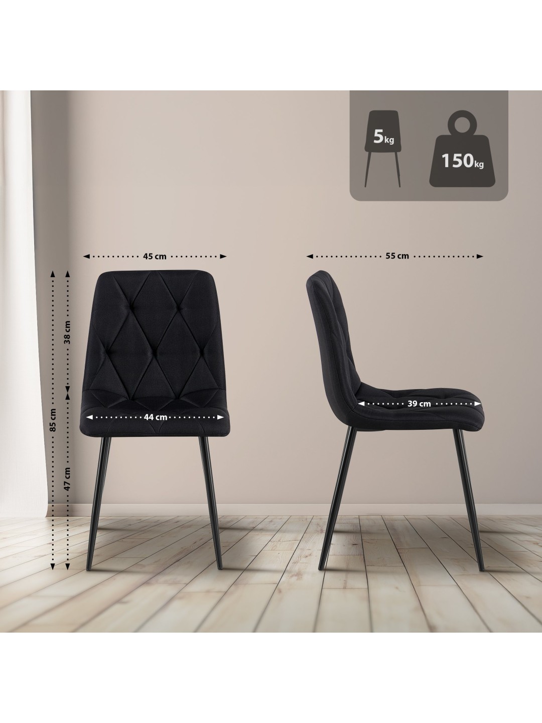 La base de esta silla de comedor es la estable estructura de cuatro patas de metal con recubrimiento en polvo negro. Esto significa que la silla Clairton puede cargarse con seguridad hasta 150 kilogramos. Los protectores de suelo evitan daños en suelos sensibles.