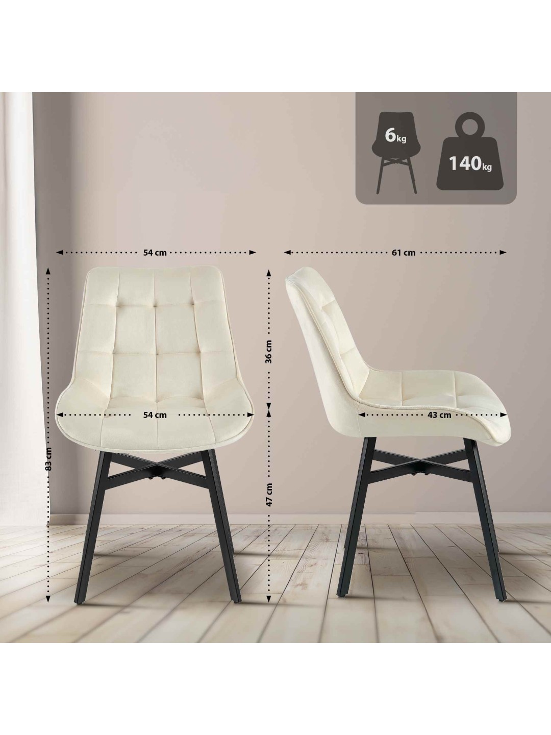 La base de esta silla de comedor es la estable estructura de cuatro patas de metal negro. Esto significa que la silla Colby puede cargarse con seguridad hasta 140 kilogramos. Los protectores de suelo evitan daños en suelos sensibles.