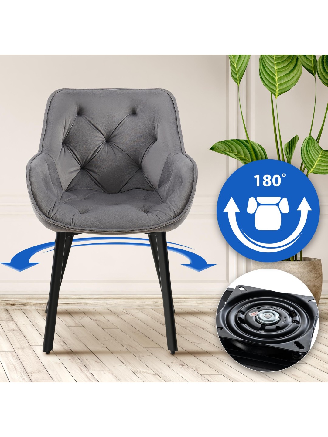 La silla tiene un asiento generosamente acolchado con un moderno patrón acolchado. La tapicería le permite sentarse cómodamente incluso durante un período de tiempo más largo. La llamada función de giro garantiza que el asiento pueda girarse en un rango de 180 grados y vuelva automáticamente a su posición inicial. Esto proporciona una libertad de movimiento adicional. El confort del asiento se complementa con el respaldo y los reposabrazos.