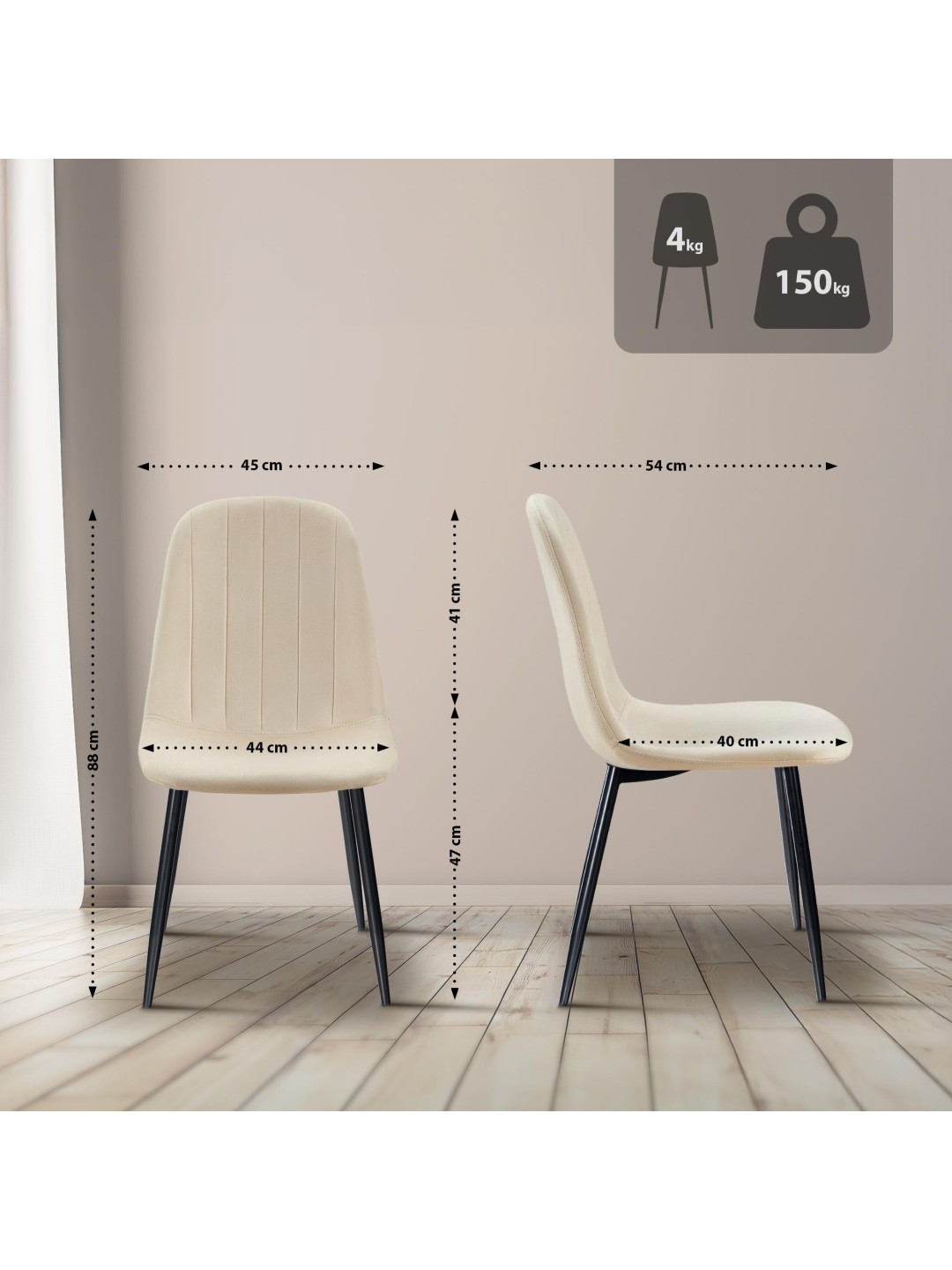 La base de esta silla de comedor es la estable estructura de cuatro patas de metal resistente en color negro mate. La silla Baxter puede cargar hasta 150 kilogramos sin dudarlo. Los protectores de suelo evitan daños en suelos sensibles. Están disponibles colores sutiles y amigables.
