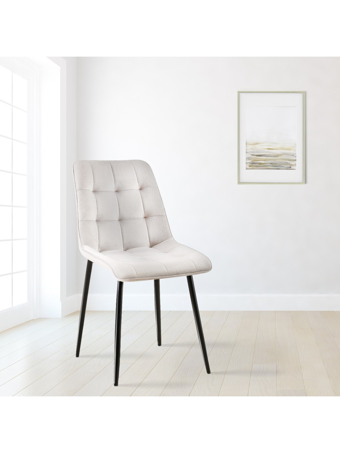 La base de esta silla de comedor es la estable estructura de cuatro patas de metal resistente en color negro mate. Esto significa que la silla Gifford puede cargarse con seguridad hasta 120 kilogramos. Los protectores de suelo evitan daños en suelos sensibles.
