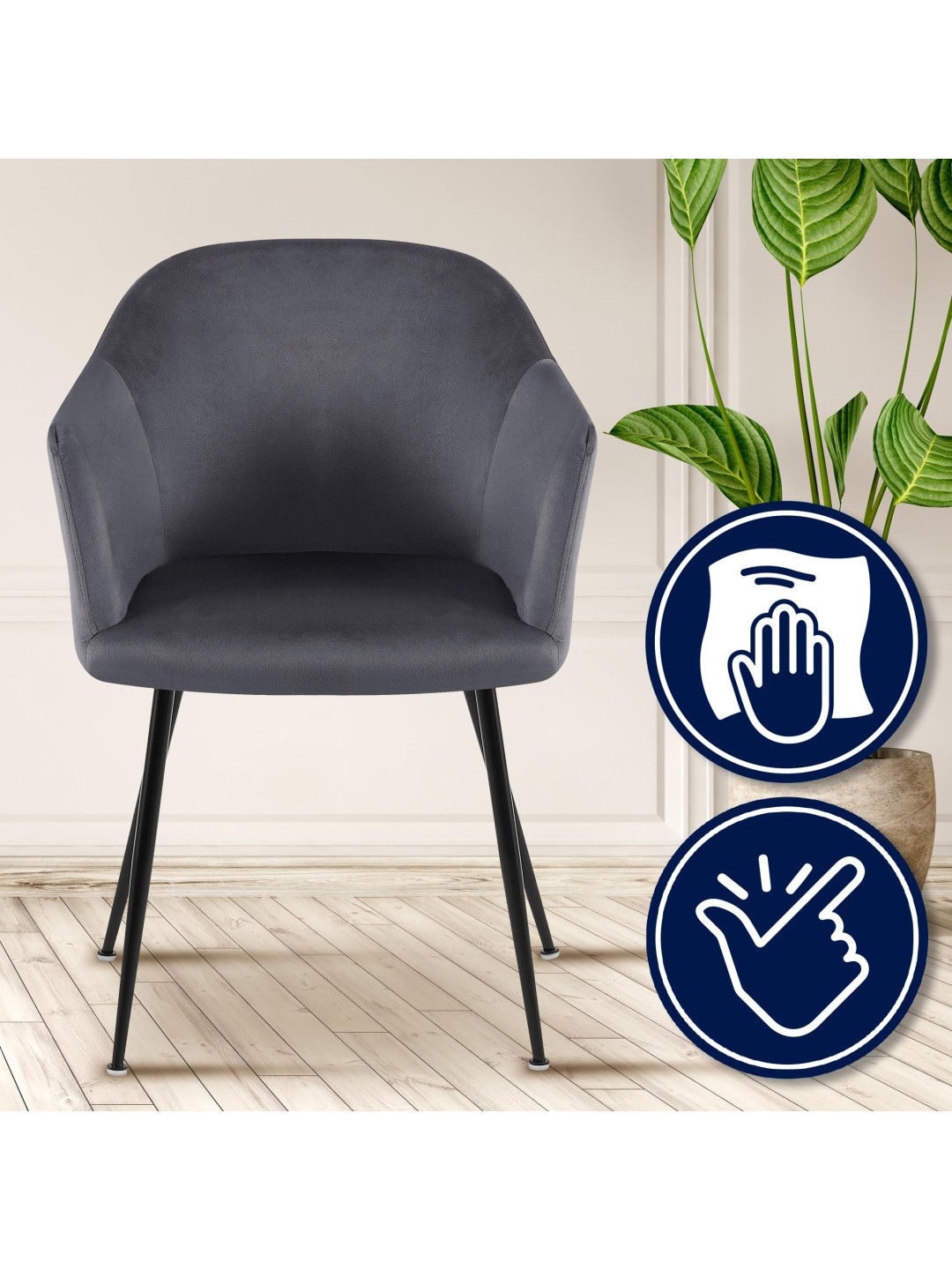 La clave para un asiento cómodo es el agradable acolchado del asiento, el respaldo y los reposabrazos. La carcasa del asiento y el respaldo están cubiertos completamente con una funda de terciopelo de fácil cuidado.