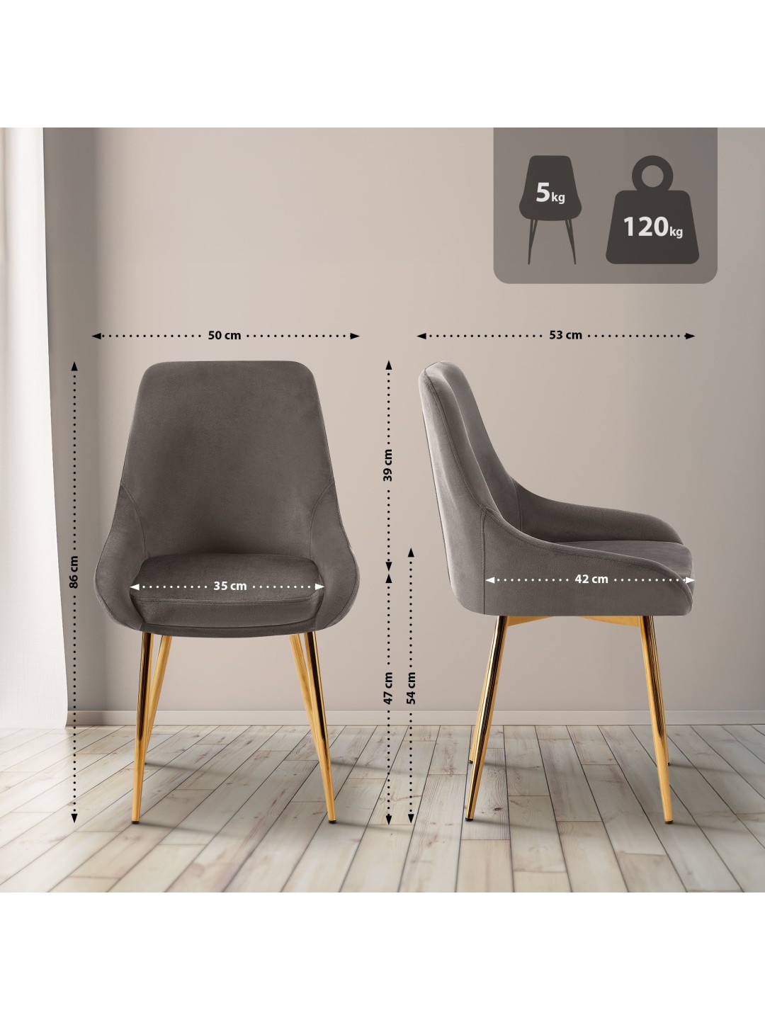 Experimente una experiencia de asiento cómoda y elegante con la silla de comedor Elmira. Esta moderna silla de comedor es el complemento perfecto para cualquier comedor gracias a su elegante diseño fabricado en terciopelo de alta calidad. La sólida elaboración y la construcción robusta caracterizan a la silla Elmira, que puede soportar hasta 150 kg. Con una altura de asiento fija de 47 cm y un asiento acolchado, ofrece una comodidad óptima durante largos períodos de tiempo.
