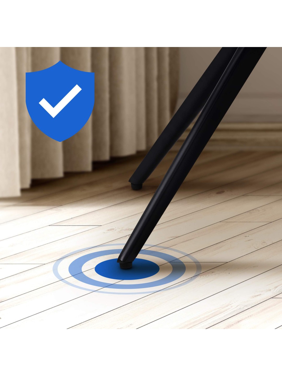 La base de esta silla de cocina es la estructura de cuatro patas de metal con recubrimiento en polvo en color negro mate. La silla de comedor Merna se puede cargar sin problemas con hasta 120 kilogramos. Los protectores de suelo evitan que los suelos delicados se dañen.