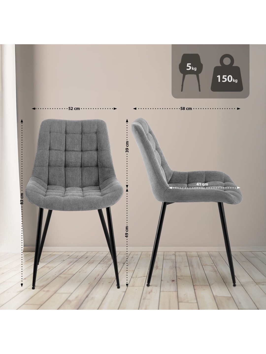 La clave para un asiento cómodo es el agradable acolchado sobre el asiento y el respaldo. Tanto la carcasa del asiento como el respaldo están completamente cubiertos con una elegante funda de pana. El elegante patrón acolchado llama la atención.