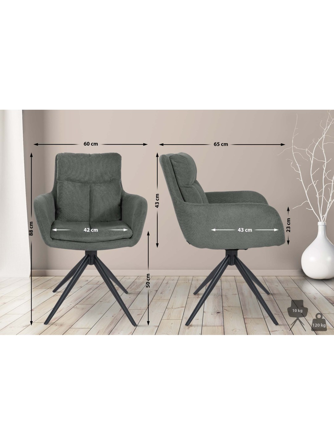 La base de esta silla tipo sillón es la estructura de cuatro patas de hierro resistente en color negro mate. Esto significa que la silla de comedor Vilas se puede cargar sin problemas con hasta 120 kilogramos. Se encuentran disponibles para elegir colores sutiles y amigables (siete en total).