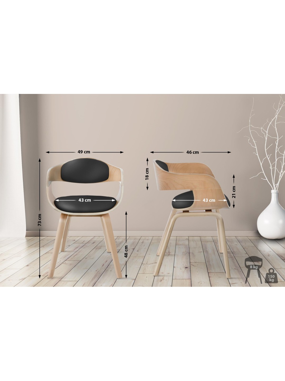 La silla de visita se compone de una robusta carcasa de madera, que tiene un acolchado de alta calidad de espuma fría dimensionalmente estable y una funda de cuero sintético en la zona del respaldo y del asiento. La estructura de 4 pies de madera maciza convence por su forma individual, que le da a la silla un aspecto bonito y moderno. La estructura contribuye a la buena estabilidad y longevidad de la silla para visitas. Debajo de los pies hay protectores de suelo que protegen el suelo de arañazos antiestéticos. La silla de comedor es especialmente fácil de cuidar gracias a su funda de piel sintética y se puede limpiar fácilmente con un paño de algodón húmedo y el accesorio de aspiradora adecuado. La silla de sala de espera Kingston está disponible en varios colores de madera y tapizado.