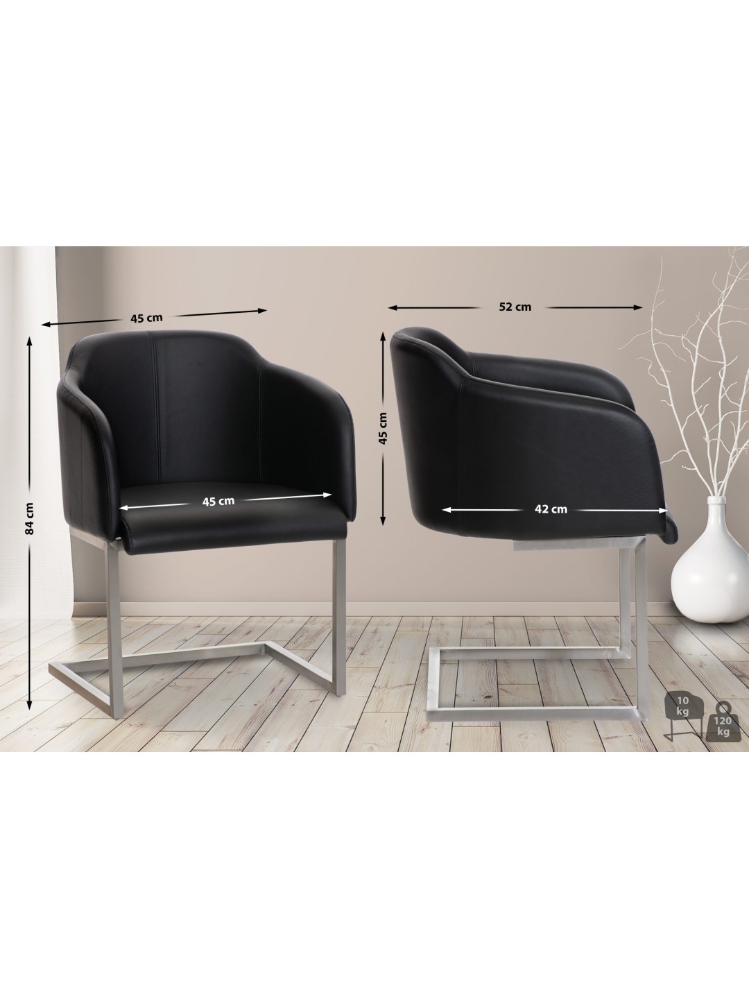 Su estructura voladiza recta de acero inoxidable cepillado llama la atención y el ligero balanceo del asiento se percibe como muy agradable. El respaldo del asiento apoya la zona lumbar, mientras que el asiento y el respaldo están generosamente acolchados. La tapicería tiene una funda duradera de piel sintética que es fácil de cuidar.