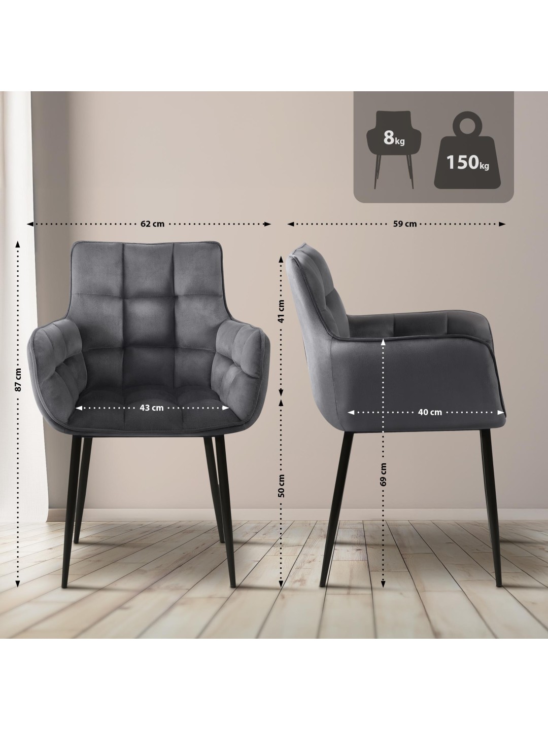 La clave para un asiento cómodo es el agradable acolchado del asiento, el respaldo y los reposabrazos. La carcasa del asiento y el respaldo están completamente tapizados en terciopelo. El patrón acolchado de cuadros crea una apariencia elegante.