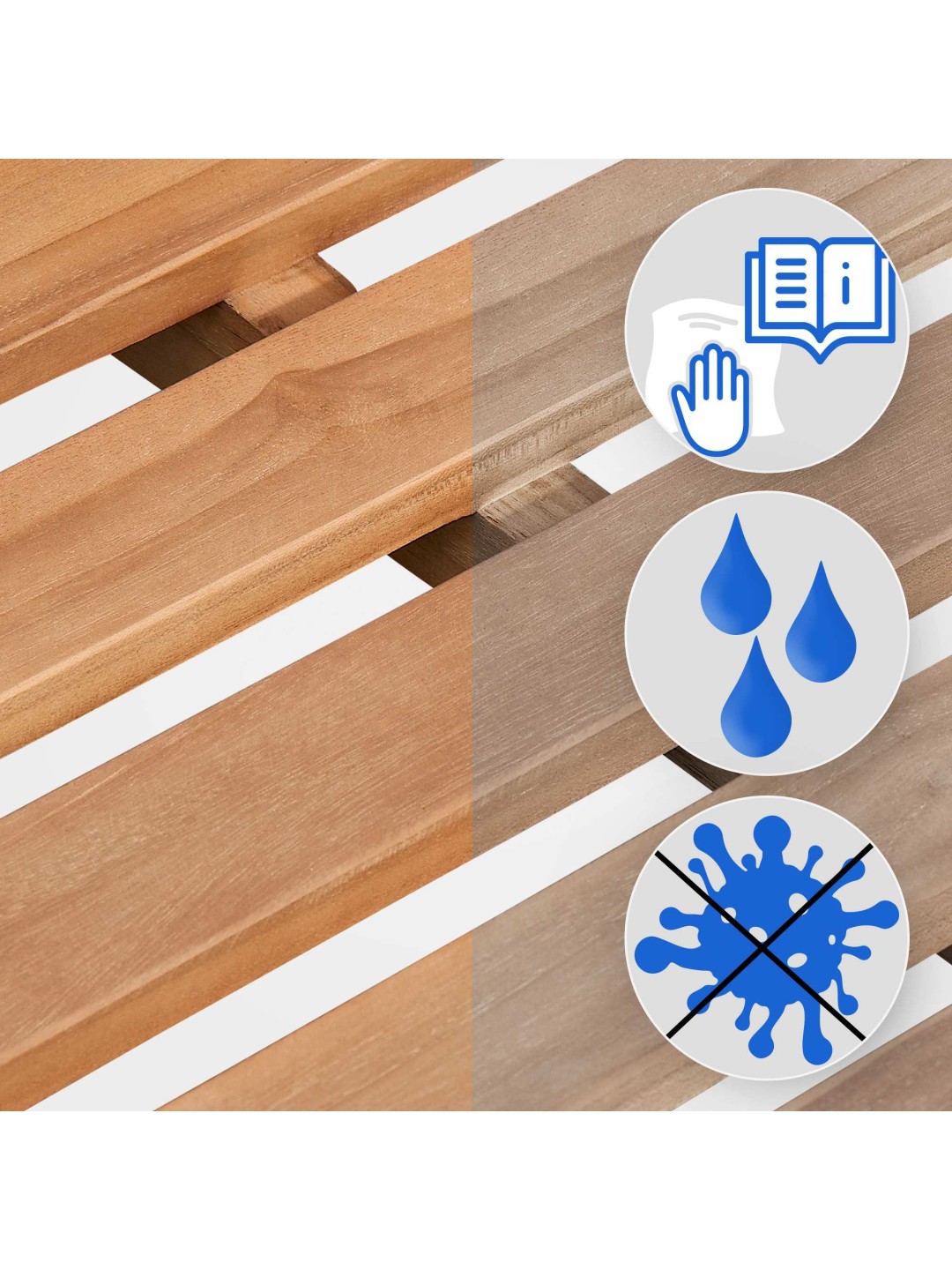 La teca utilizada es completamente resistente a la intemperie, por lo que el banco puede estar expuesto a la intemperie durante todo el año. Ni siquiera las heladas y la nieve dañan la madera, mientras que la madera maciza evita que se forme moho o se pudra. Si no se utiliza aceite de teca, la madera sólo recibirá una pátina gris, que no afecta su longevidad y estabilidad.