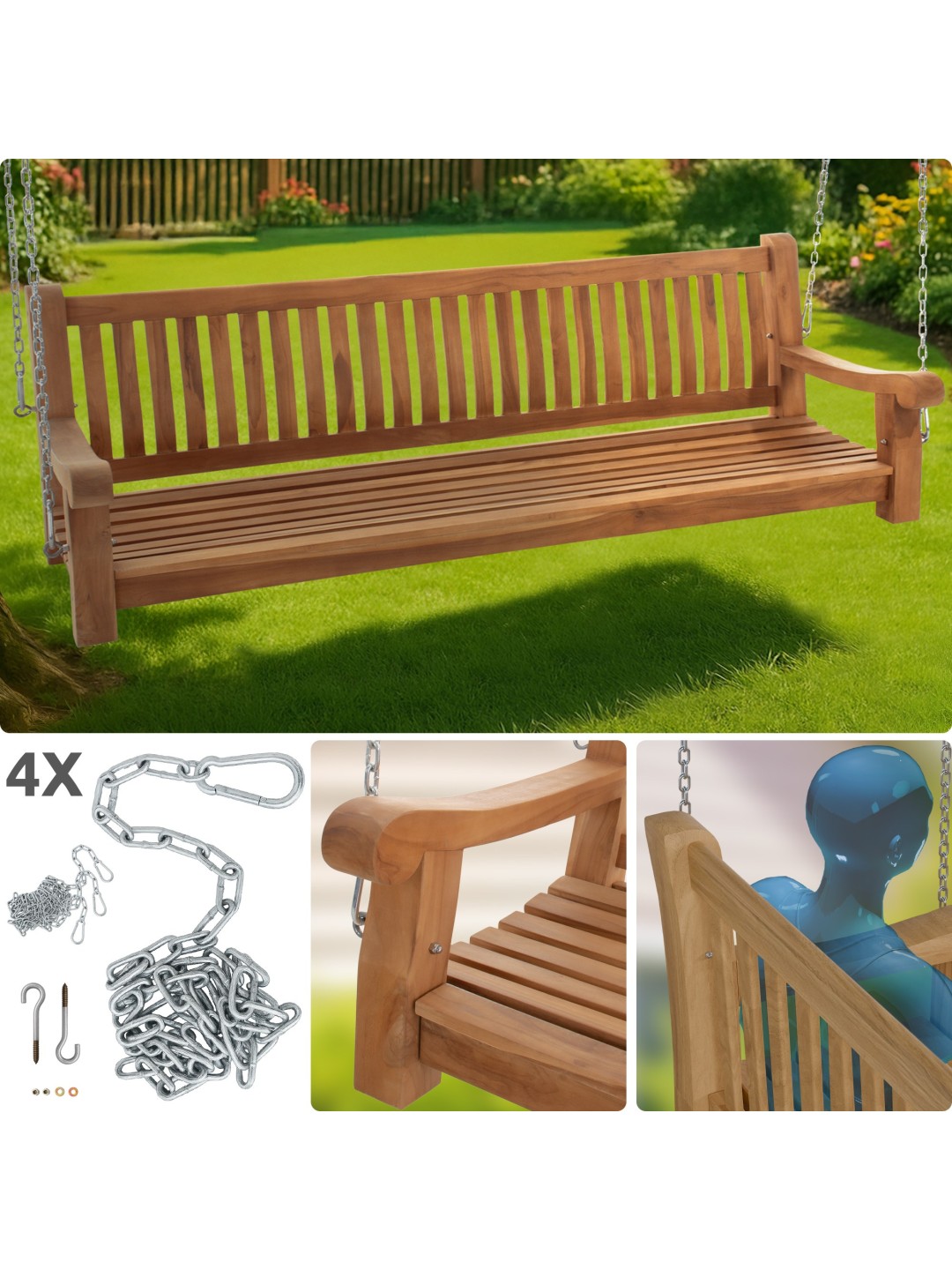 El columpio de jardín tiene un aspecto elegante con su exterior sencillo y el color marrón dorado de la madera de teca y se puede combinar con una variedad de estilos de decoración diferentes. El banco es ideal para relajarse. La zona de asientos está ligeramente curvada, por lo que el banco resulta cómodo incluso sin tapizado. El banco de teca también está equipado con reposabrazos a los lados.