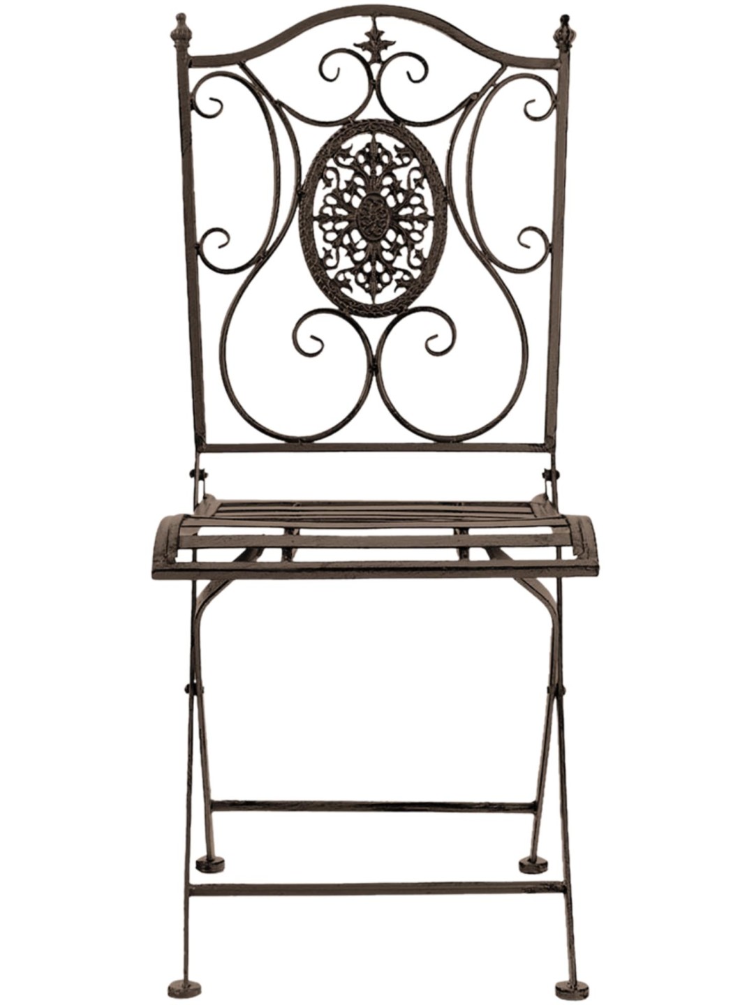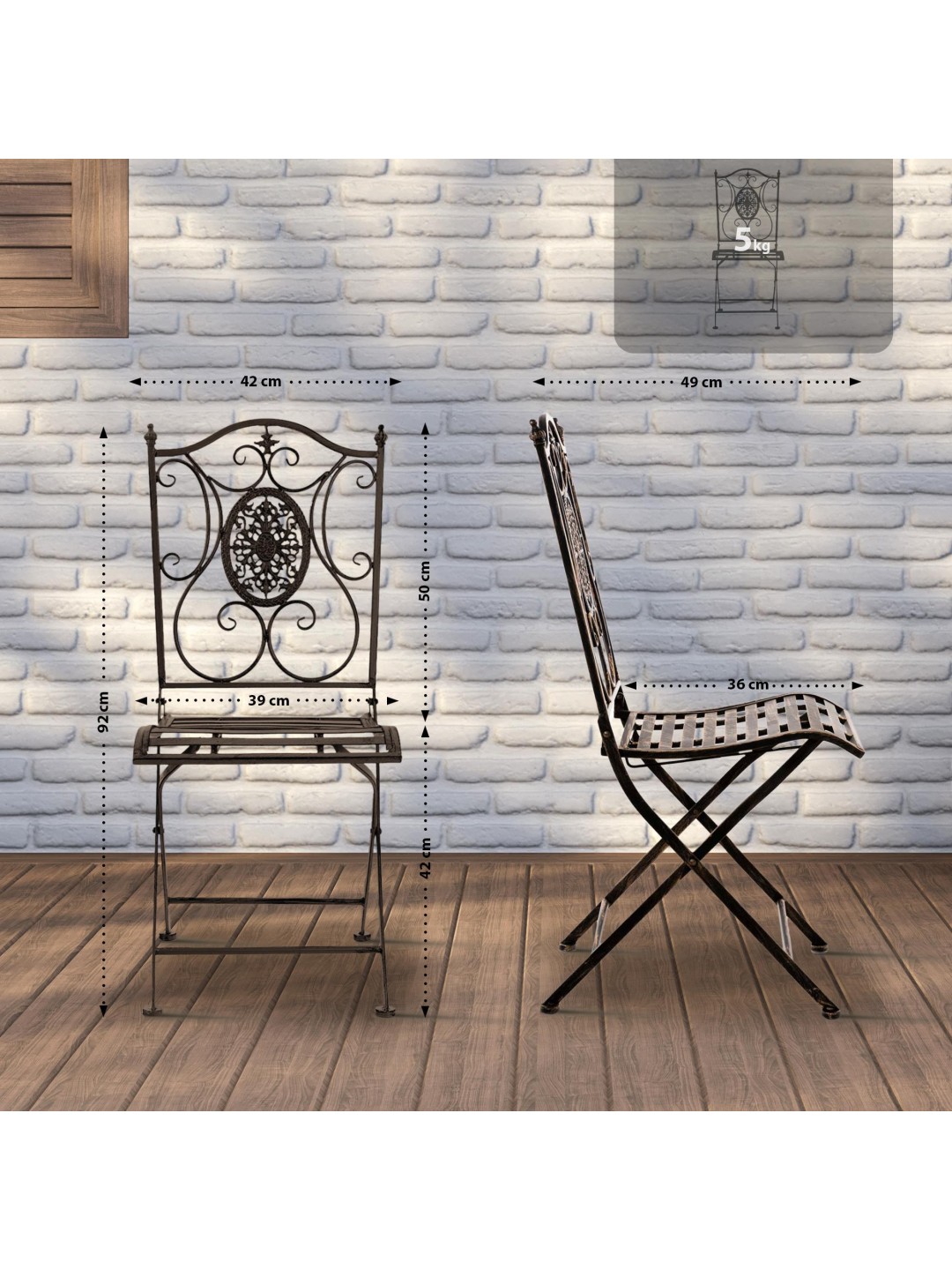 Si es necesario, las sillas de hierro se pueden plegar y guardar fácilmente para ahorrar espacio. El producto está fabricado de hierro y, por tanto, es extremadamente estable. La superficie está acabada con una pátina antigua hecha a mano.