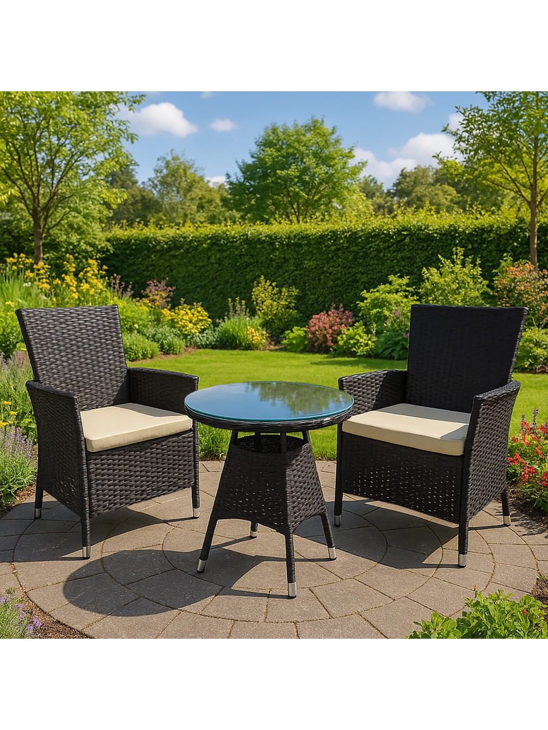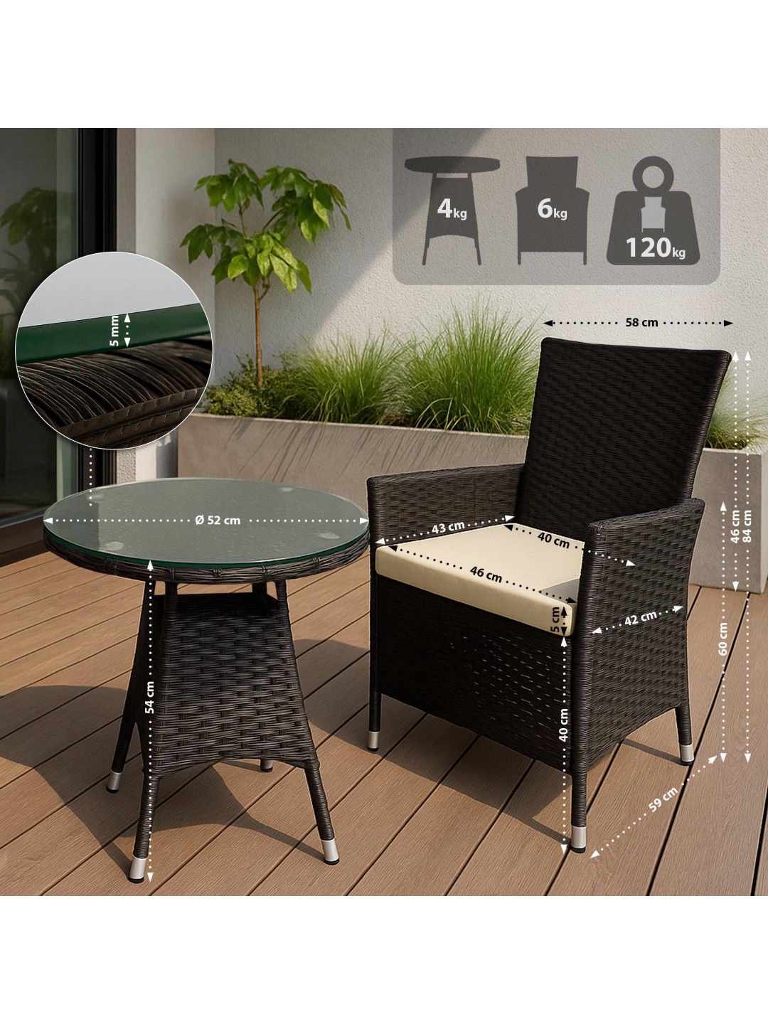 Descubre el moderno conjunto de mesa de comedor Fireda, ideal para reuniones sociales en el jardín. Este elegante juego de muebles de jardín de 3 piezas, fabricado en resistente ratán PE, ofrece suficiente espacio para dos personas y convence por su combinación de diseño y comodidad.