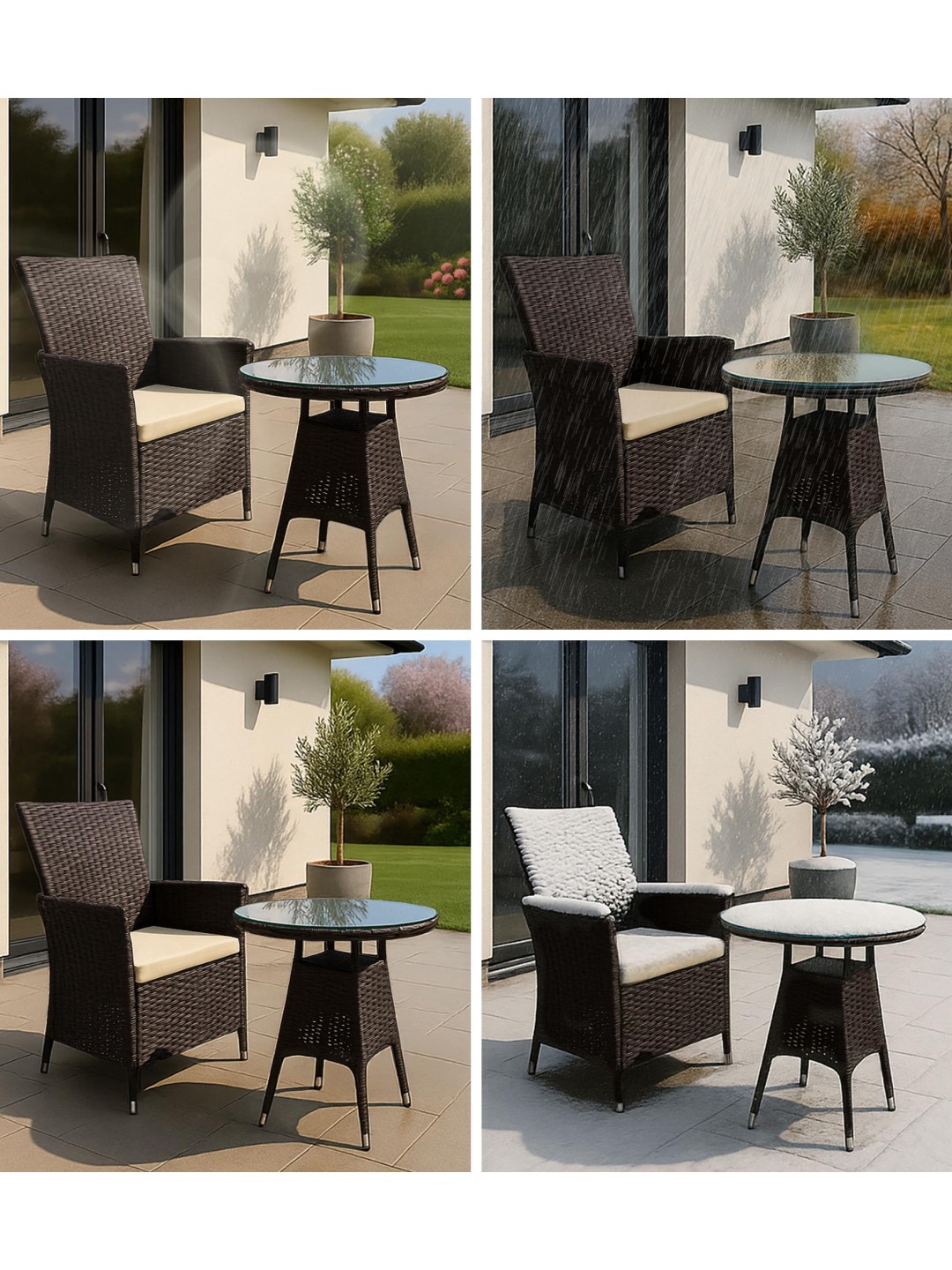 Aproveche los cojines de asiento de alta densidad, desenfundables y lavables, de 5 cm de espesor, equipados con fundas de poliéster de 180 g/m². La mesa de centro con un elegante tablero de cristal de seguridad de 5 mm completa el conjunto a la perfección e invita a relajarse y descansar. La robusta estructura de plástico garantiza un soporte seguro, mientras que la entrega parcialmente montada garantiza un fácil manejo.