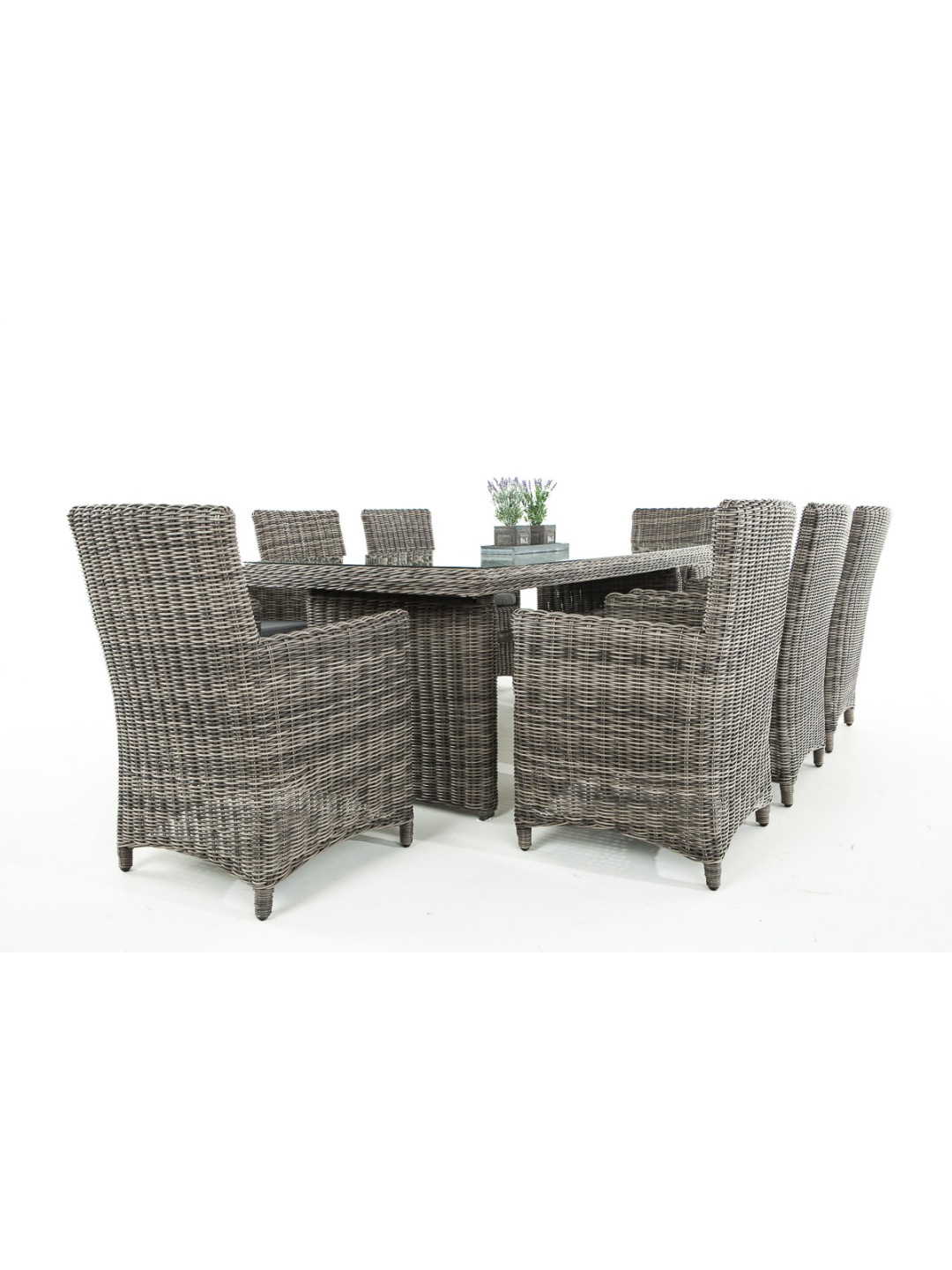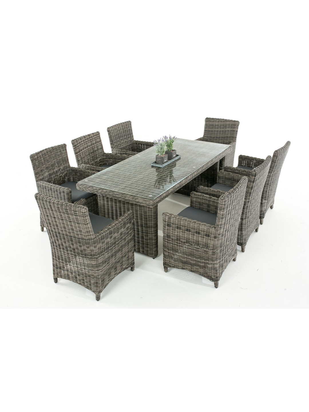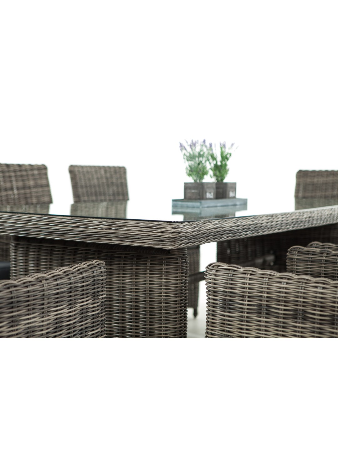 Combinación de alta calidad: elegante y ergonómica. Gracias al respaldo inclinado combinado con los agradables reposabrazos elevados y al cómodo cojín del asiento, que ya está incluido en el suministro, estas sillas de jardín son ideales para sentarse. Su estructura está completamente trenzada con poliratán, lo que no sólo crea un aspecto atractivo sino que también proporciona una estabilidad especialmente alta. En la mesa de este juego, las patas en cada extremo de la mesa están estrechamente entrelazadas de manera similar. La unión entre la malla compacta y el tablero de cristal resulta muy exitosa. Se apoya en sus bordes redondeados mediante cuatro pomos de goma transparentes antideslizantes.