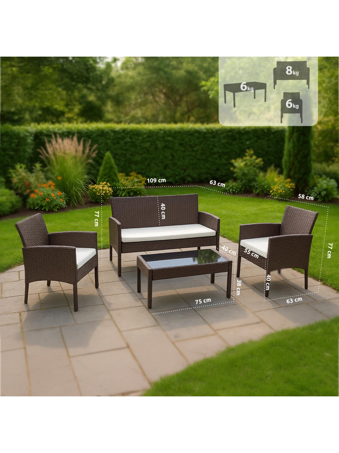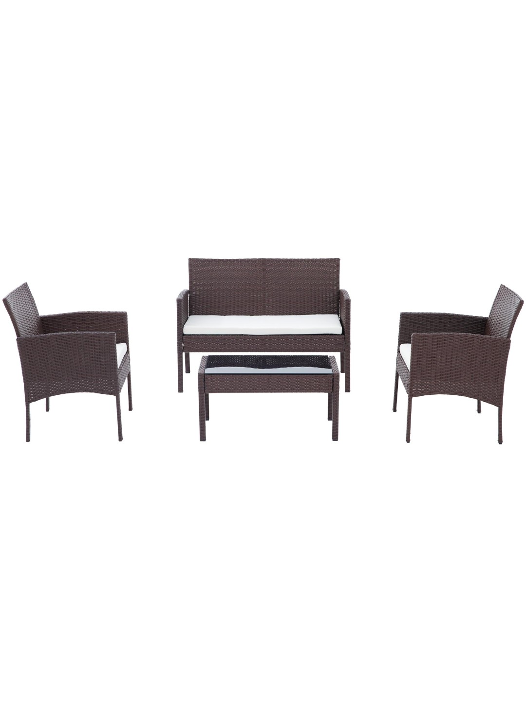 El conjunto de muebles de jardín se compone de dos sillones, un sofá para dos personas y una mesa de jardín con tablero de cristal. El juego también incluye cómodos cojines de asiento que, junto con los respaldos, aumentan la comodidad al sentarse. Los cojines del respaldo y del asiento incluidos no destiñen y son resistentes a la intemperie, por lo que se mantienen bonitos durante mucho tiempo.