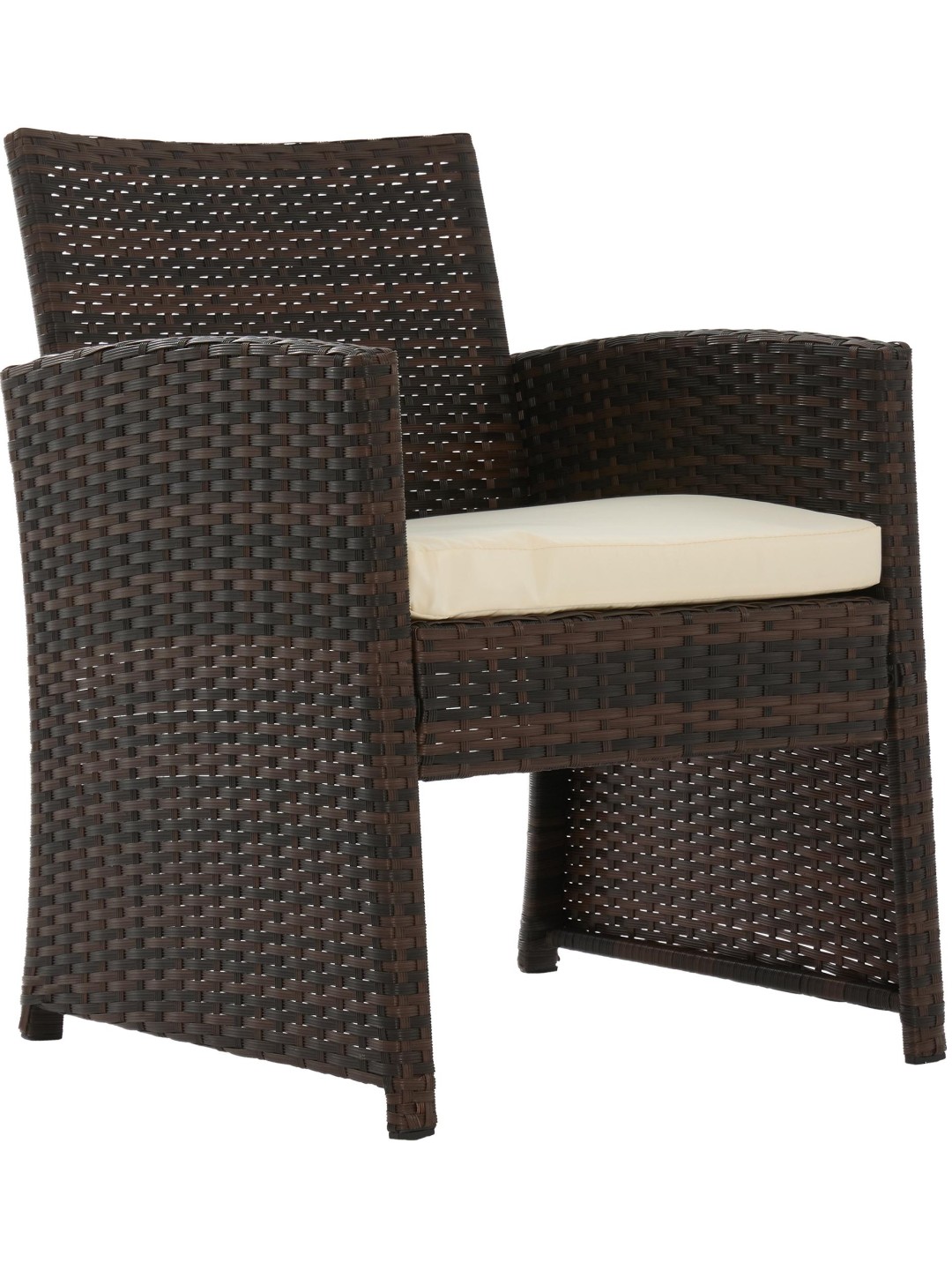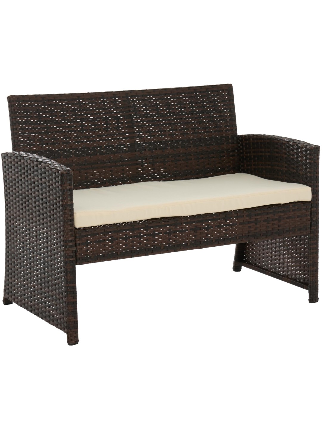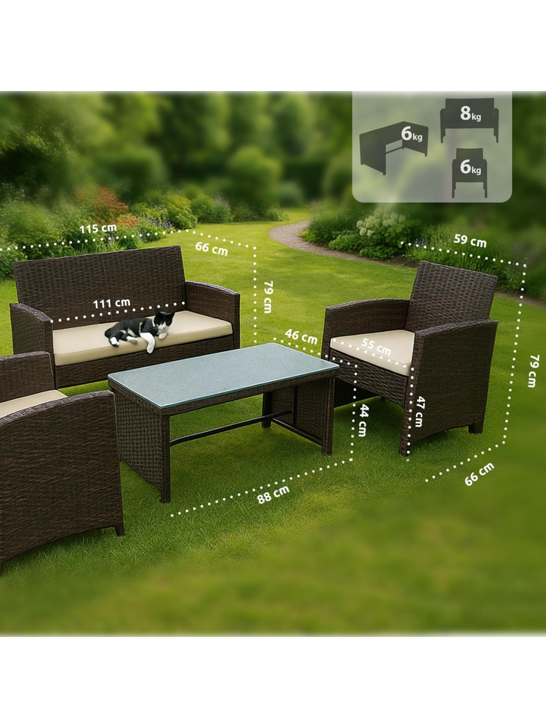 El conjunto de muebles de jardín se compone de dos sillones, un sofá para dos personas y una mesa de jardín con tablero de cristal. El juego también incluye cómodos cojines de asiento que, junto con los respaldos, aumentan la comodidad al sentarse.