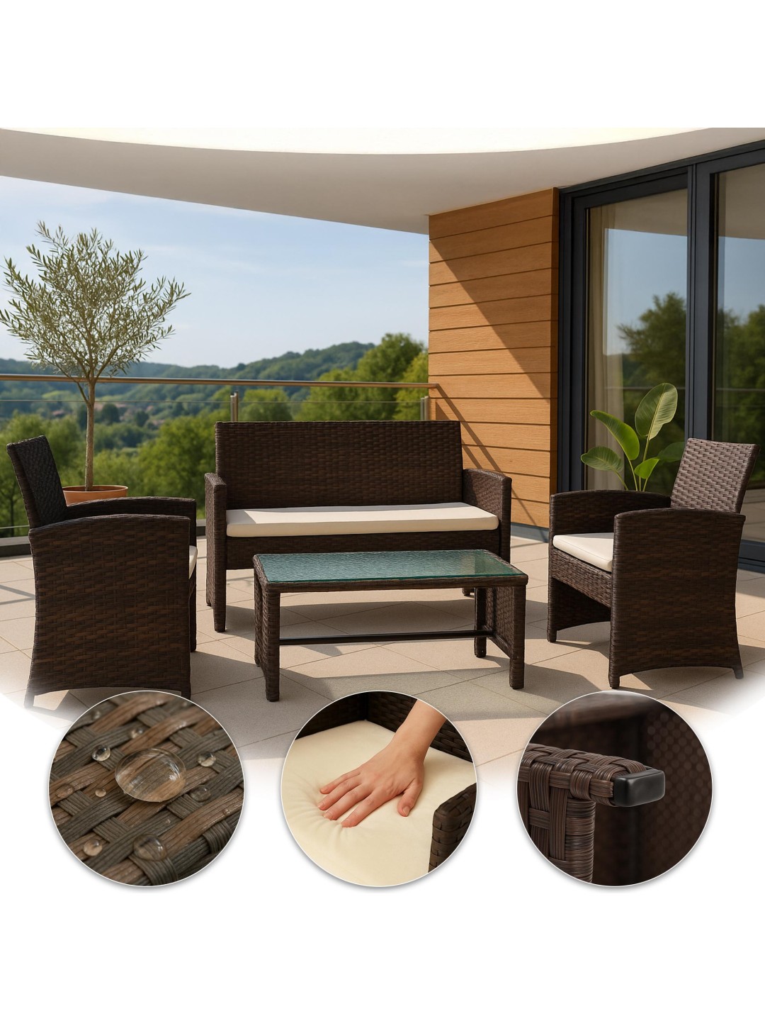 Este juego de muebles de jardín de 4 piezas de ratán PE ofrece espacio para hasta cuatro personas y convence por su material resistente a la intemperie y a los rayos UV. Esto hace que los muebles de salón sean ideales para su uso en el jardín, la terraza y el balcón.
