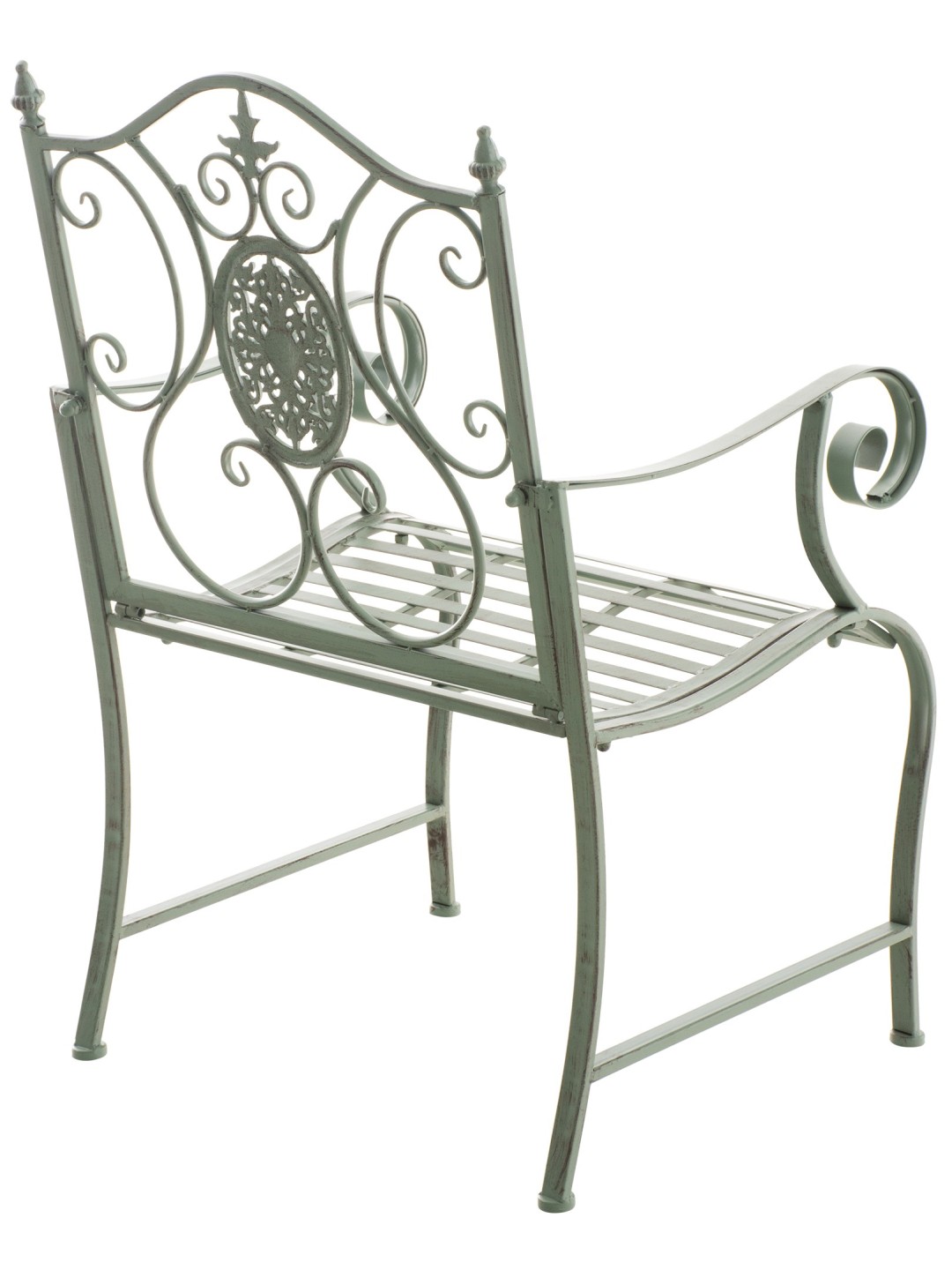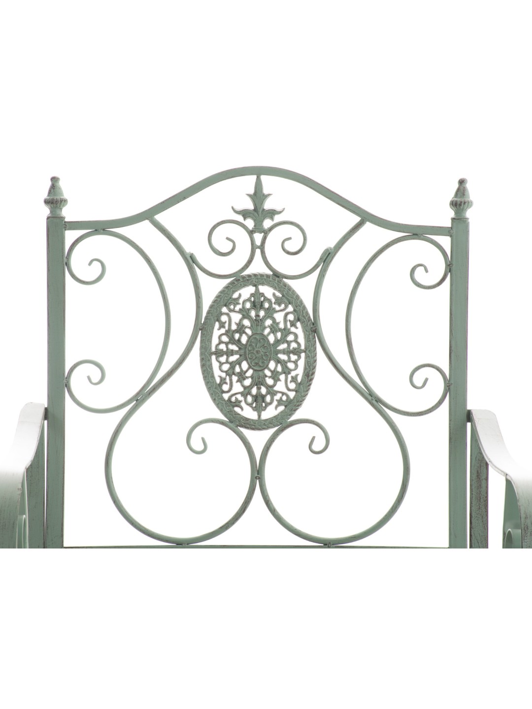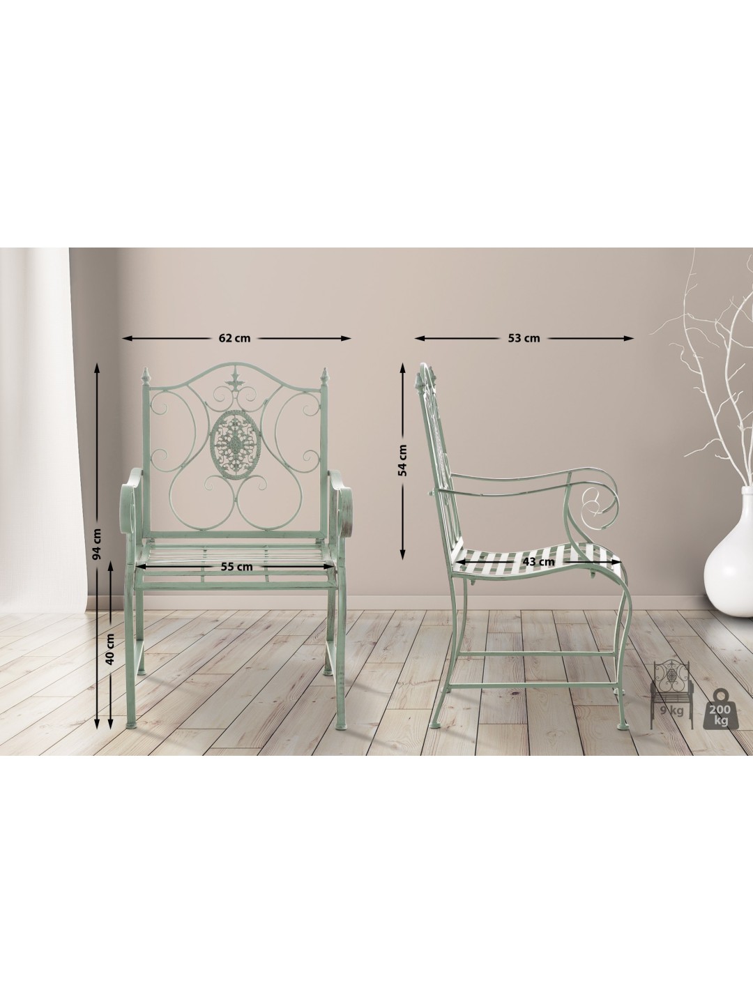 Las sillas están hechas de hierro pintado. Las sillas de hierro son fáciles de cuidar y se pueden limpiar con un paño húmedo y un detergente suave. Las superficies de las sillas de jardín están revestidas con una hermosa pátina, a juego con las hermosas decoraciones. Las sillas de jardín deben protegerse de las influencias climáticas directas.