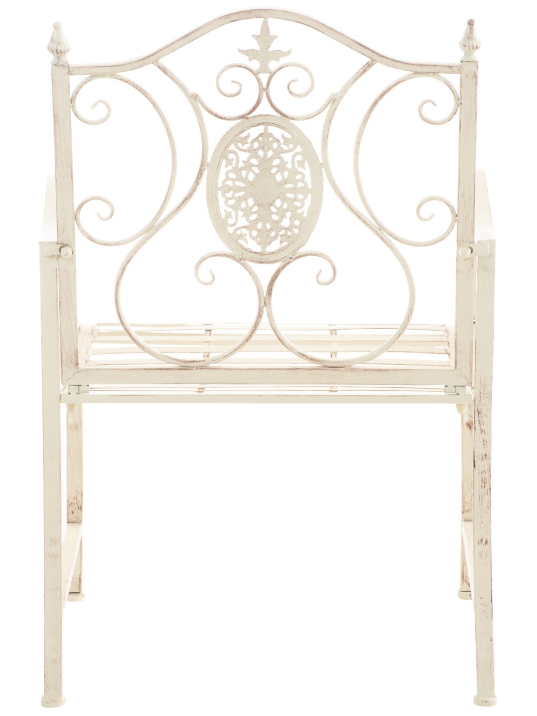 La silla está hecha de hierro pintado. La silla de hierro es fácil de cuidar y se puede limpiar con un paño húmedo y un detergente suave. La superficie de la silla de jardín está rematada con una hermosa pátina, a juego con las hermosas decoraciones. La silla de jardín debe protegerse de las influencias climáticas directas.