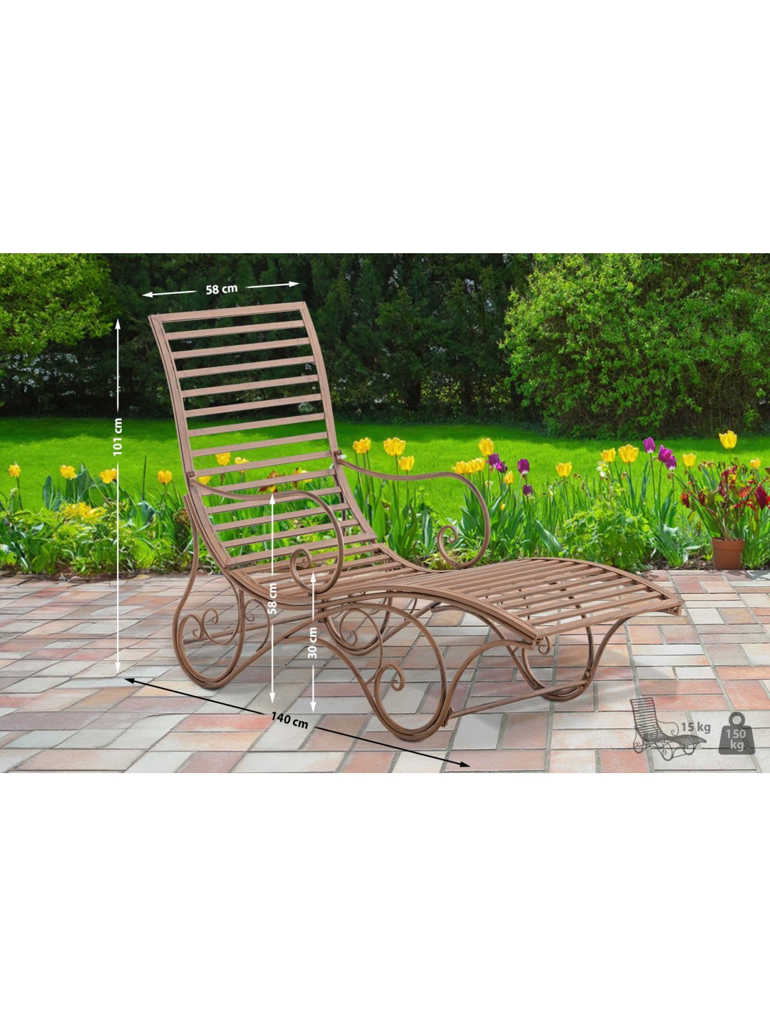 Con una capacidad de carga máxima de 150 kg, la tumbona ofrece suficiente estabilidad para relajarse durante horas al aire libre. Ya sea como asiento o como elegante pieza decorativa.