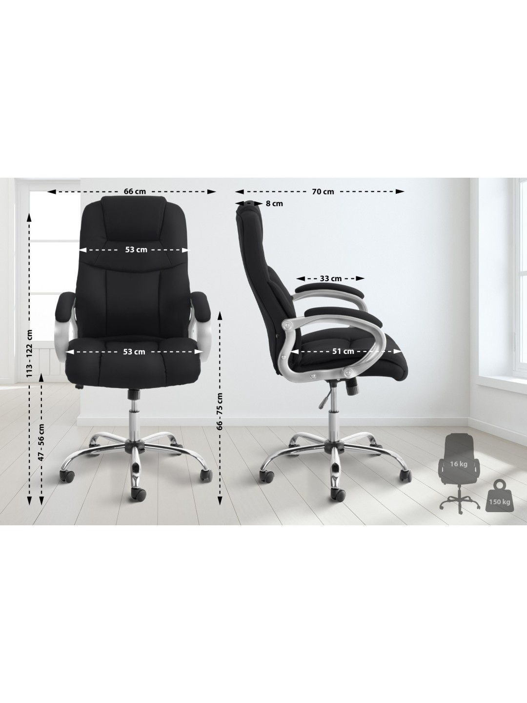 La silla de oficina ofrece una altura de asiento ajustable de 47 a 56 cm para garantizar un confort óptimo. Con una capacidad de carga de hasta 150 kg, el Apollo XL convence por su robustez y longevidad. Los reposabrazos no son ajustables, pero proporcionan un apoyo estable. El respaldo inclinable, que se puede fijar en una posición, complementa la cómoda experiencia de sentarse con su adaptabilidad.