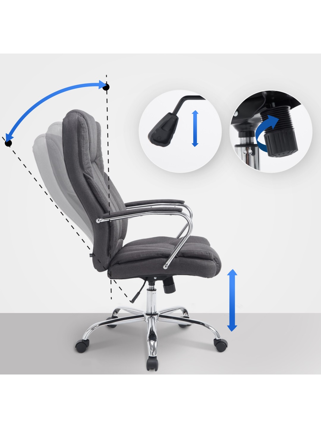 La silla ejecutiva Xanthos es una silla de oficina exclusiva con tapizado de muy alta calidad y un aspecto de tela moderno. La funda de tela no sólo tiene un aspecto bonito, sino que también es especialmente robusta y fácil de cuidar. Una estructura de metal estable también garantiza un soporte seguro. Además, se garantiza una sentada ergonómica gracias a la altura ajustable del asiento. Además, la altura del asiento se puede ajustar continuamente mediante una palanca debajo del asiento. Un mecanismo basculante incorporado garantiza una mayor libertad de movimiento. La silla de oficina Xanthos se apoya firmemente sobre cinco ruedas de funcionamiento suave. No importa si se trata de suelos duros o alfombrados, siempre podrá rodar con facilidad y soltura por el suelo.
