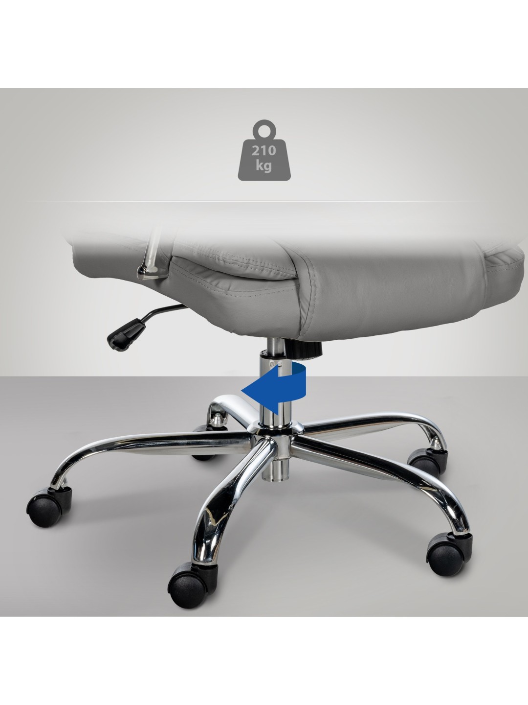 La silla de oficina BIG Xanthos está diseñada para ofrecer ergonomía y resistencia, con una capacidad de carga de hasta 210 kg. El ajuste continuo de altura y un mecanismo basculante incorporado ofrecen opciones de ajuste individuales. Los reposabrazos y respaldos acolchados, así como el ancho del asiento XXL, favorecen el confort al sentarse. Una estructura de metal con aspecto cromado y ruedas de marcha suave garantizan estabilidad y movilidad en diferentes superficies. La funda de cuero artificial es fácil de cuidar y está diseñada para un uso prolongado.