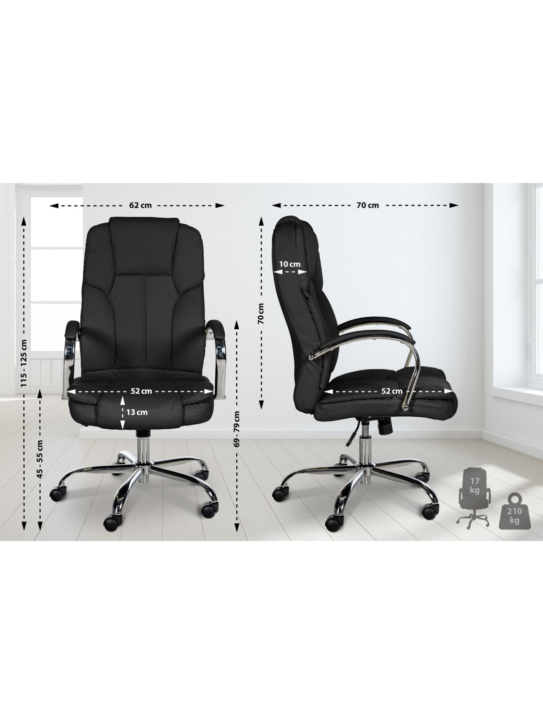 La silla de oficina BIG Xanthos está diseñada para ofrecer ergonomía y resistencia, con una capacidad de carga de hasta 210 kg. El ajuste continuo de altura y un mecanismo basculante incorporado ofrecen opciones de ajuste individuales. Los reposabrazos y respaldos acolchados, así como el ancho del asiento XXL, favorecen el confort al sentarse. Una estructura de metal con aspecto cromado y ruedas de marcha suave garantizan estabilidad y movilidad en diferentes superficies. La funda de cuero artificial es fácil de cuidar y está diseñada para un uso prolongado.