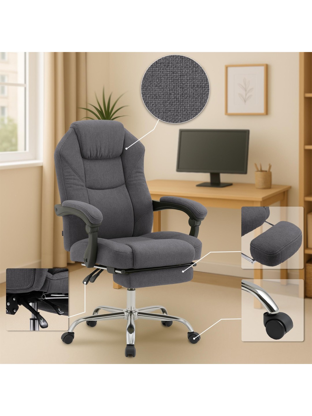 Gracias a la función de rotación de 360 grados, se mantiene total libertad de movimiento, mientras que la estable estructura de metal con un elegante aspecto cromado y cinco ruedas de funcionamiento suave garantizan una estabilidad y flexibilidad seguras.