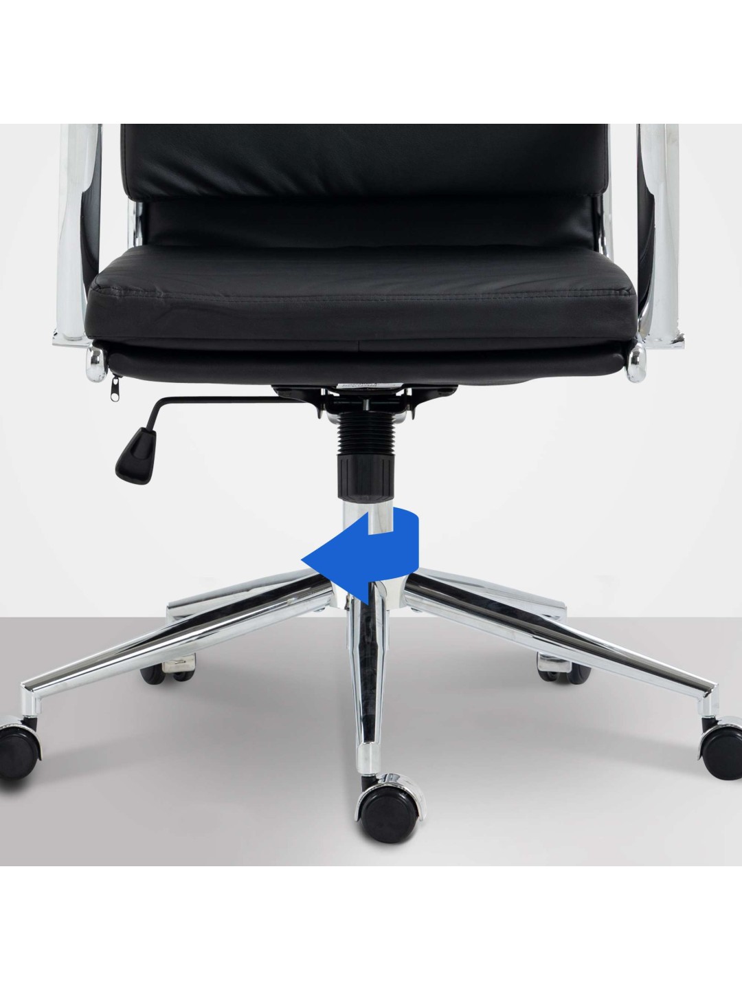 La silla de oficina Cleveland combina un diseño ergonómico con comodidad individual y una apariencia elegante. Es el complemento perfecto para cualquier oficina donde la salud y el bienestar en el lugar de trabajo sean importantes. El respaldo triple acolchado y la forma ergonómica favorecen su posición natural al sentarse. Con el asiento regulable en altura, la función basculante ajustable y las ruedas giratorias de 360°, la silla se adapta de forma flexible a sus necesidades. La elección entre revestimiento de piel auténtica, polipiel o tela le permite personalizar el diseño según su gusto personal. El marco cromado ofrece estabilidad y una larga vida útil. Con su amplio asiento, el Cleveland ofrece una comodidad óptima incluso en largas jornadas de trabajo.