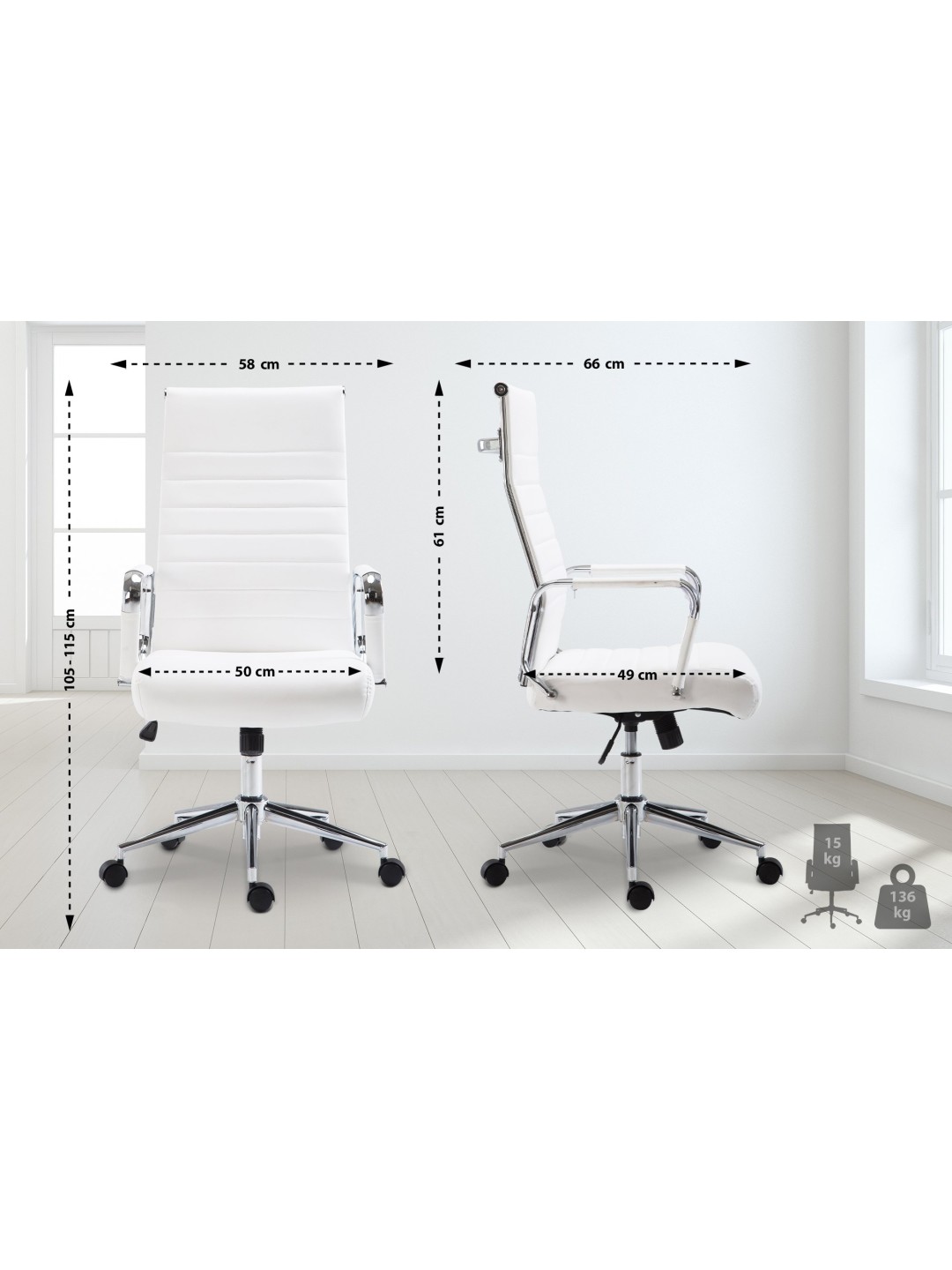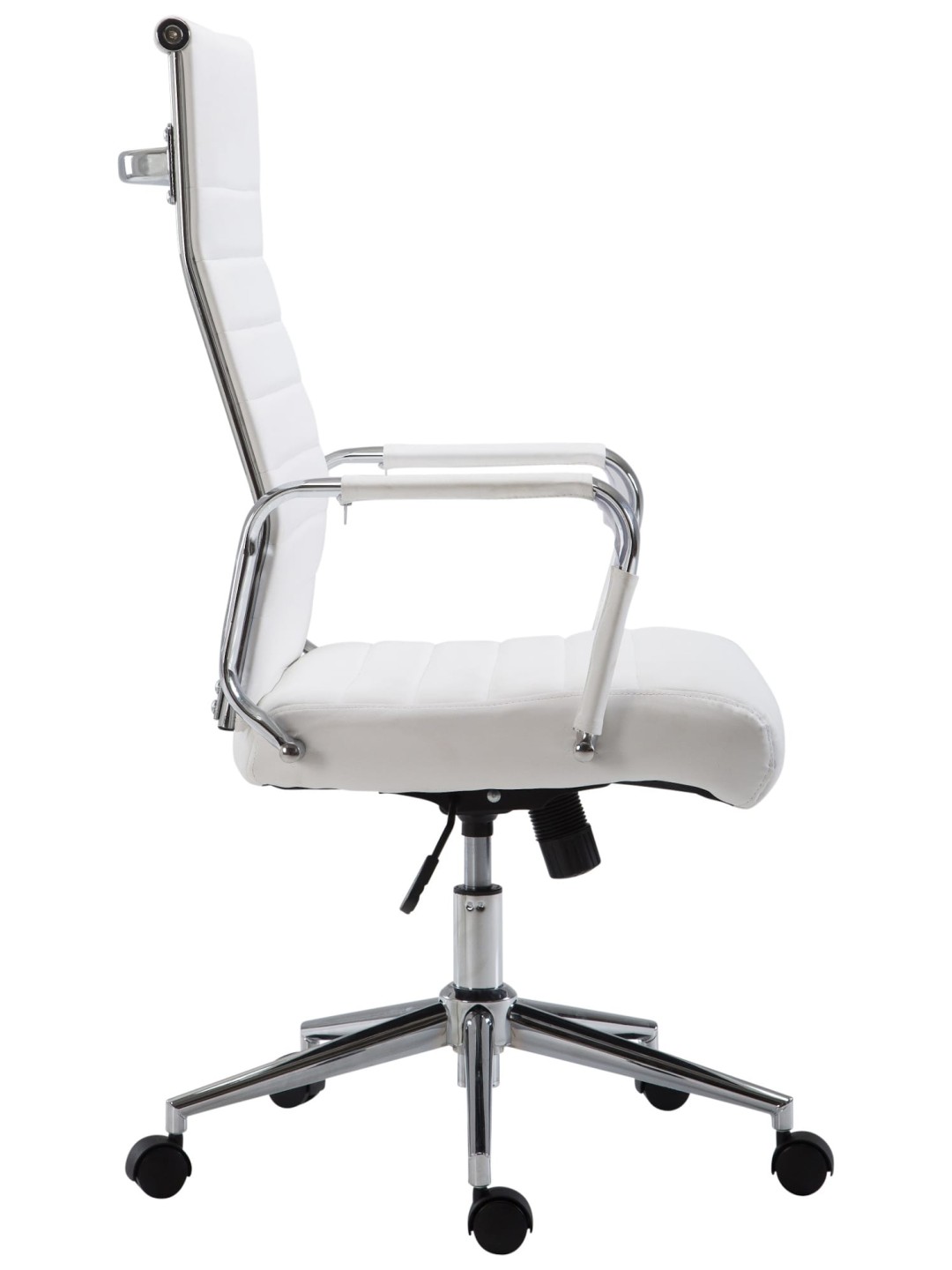 Silla de oficina ColumbusLa exclusiva silla de oficina Columbus no sólo impresiona por su aspecto moderno, sino que nadie puede superarla en términos de comodidad. Su acolchado de alta calidad y su funda de piel sintética de fácil cuidado garantizan una sensación cómoda incluso durante varias horas. Además, la altura del asiento se puede ajustar de forma continua y garantiza un asiento ergonómico. Además, la silla de escritorio está equipada con un mecanismo basculante que garantiza una mayor libertad de movimiento. La elegante estructura de metal con aspecto cromado y los robustos reposabrazos curvados con revestimiento de piel sintética le dan al conjunto un toque extra. La estabilidad está garantizada por la estructura de metal con aspecto cromado, que también está disponible en negro con cubierta negra. Las cinco ruedas de funcionamiento suave le permiten rodar fácil y cómodamente por el suelo, ya sea sobre suelos duros o alfombrados.
