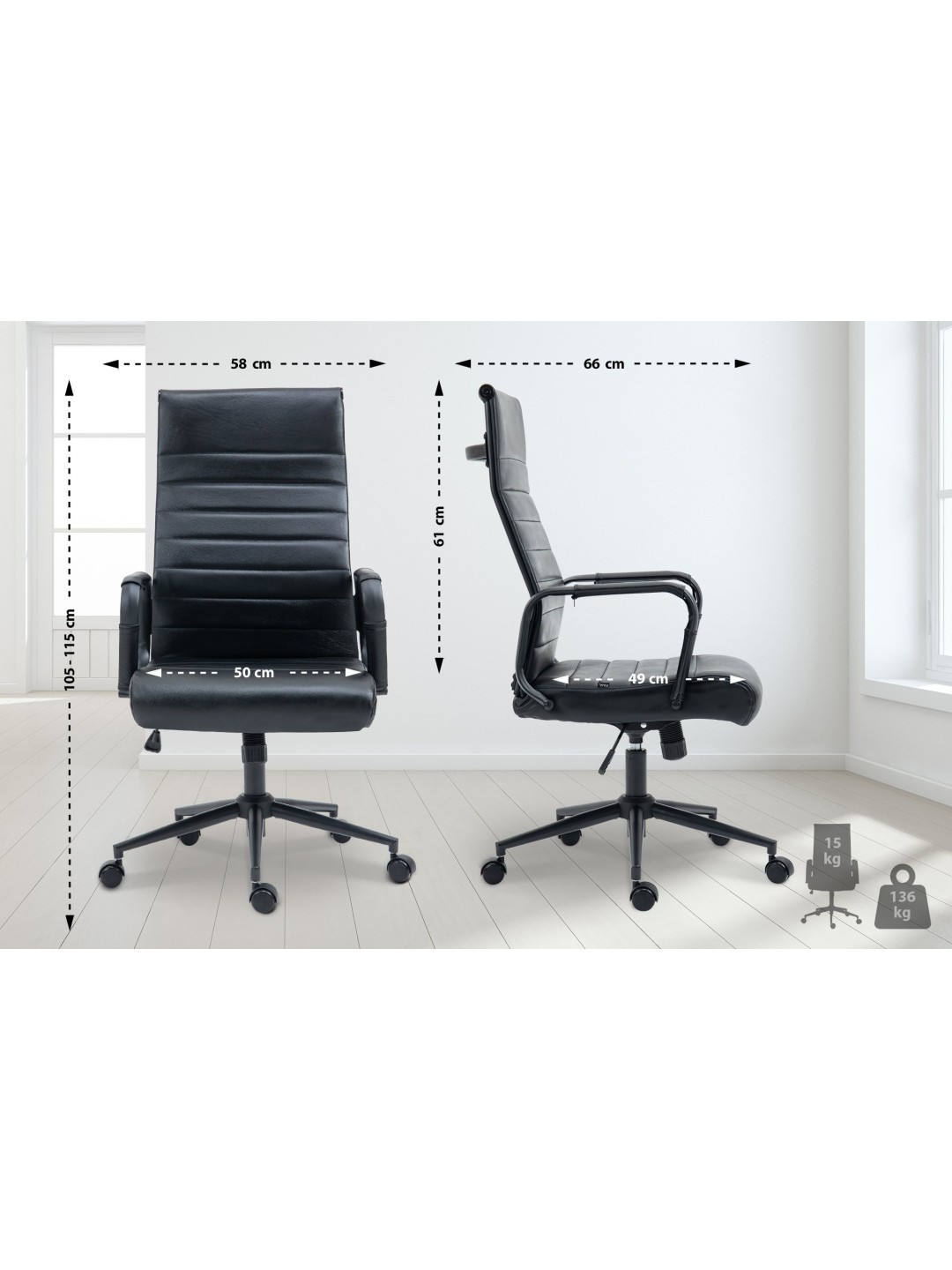 Se utilizó piel de vaca de alta calidad para cubrir el asiento y el respaldo. La altura del asiento es infinitamente ajustable y garantiza un asiento ergonómico. Además, la silla de escritorio está equipada con un mecanismo basculante que garantiza una mayor libertad de movimiento.