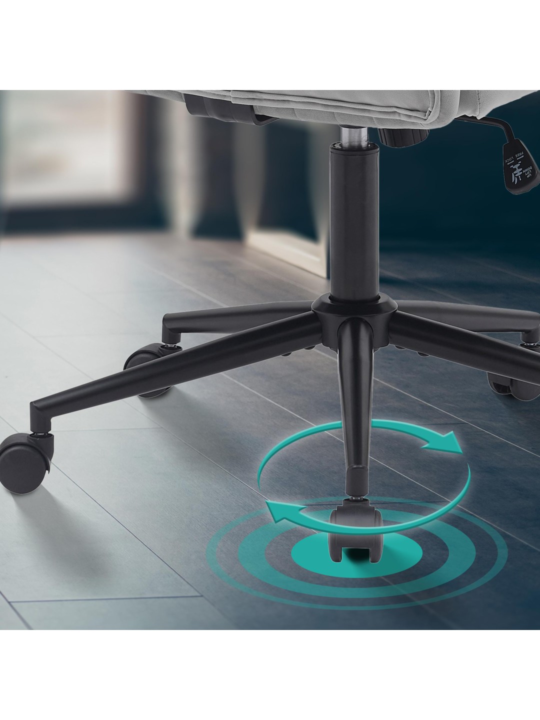 La silla de escritorio es ajustable en altura y puede girar 360 grados, por lo que puede adaptarla individualmente a sus necesidades. Gracias a las cinco ruedas de marcha suave, la silla se puede mover sin esfuerzo y sin dañar el suelo. La tensión del mecanismo basculante integrado se puede ajustar.