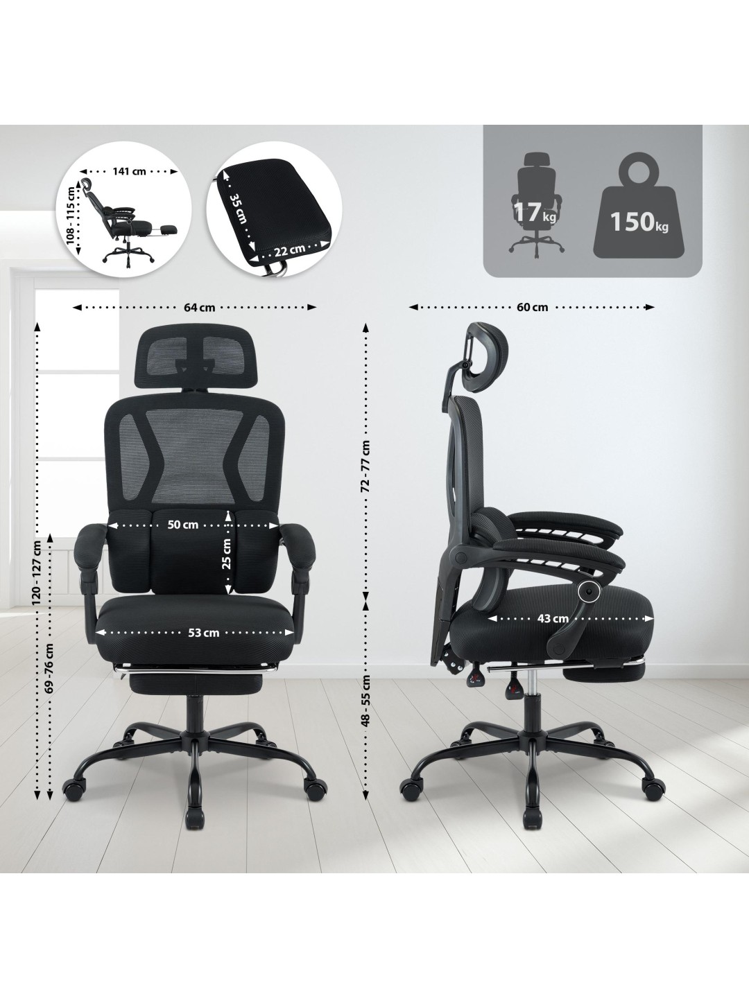Hecho de plástico duradero y un elegante marco negro, el Liberton combina estilo y funcionalidad. Los reposabrazos regulables en altura y el práctico reposapiés completan el confort del asiento. Con su robusta base de acero KD de 350 mm y un resorte de gas de alta calidad, la silla soporta hasta 150 kg.